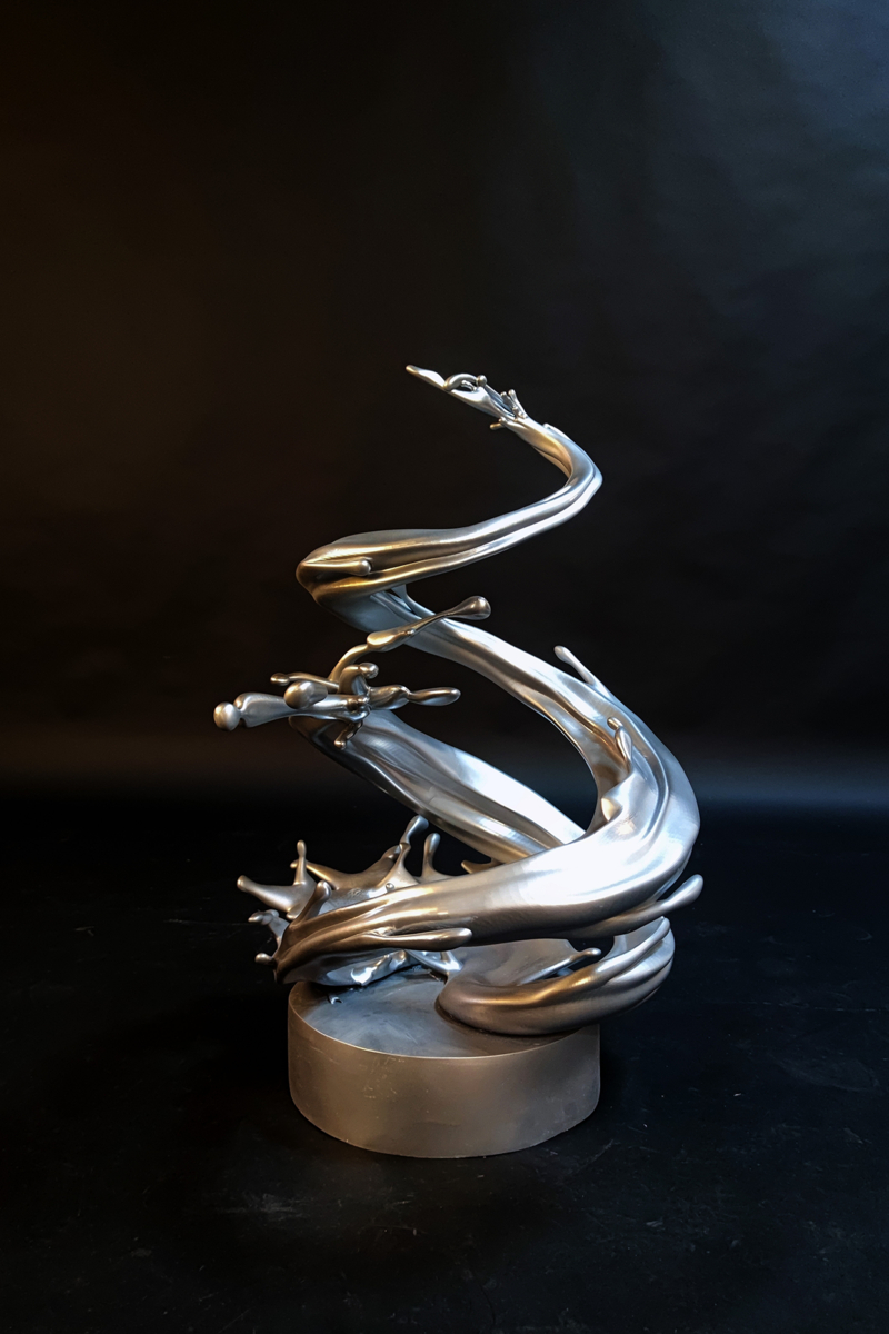 作者:王合壮作品简介:该作品以葫芦为原型,将其抽象化与水元素相融合,赋予其“流动”的特征。从动态上看,水在物理的作用下,自上而下流动又自下而上盘旋上升,动态宛如一条龙在盘旋而飞扶摇直上。