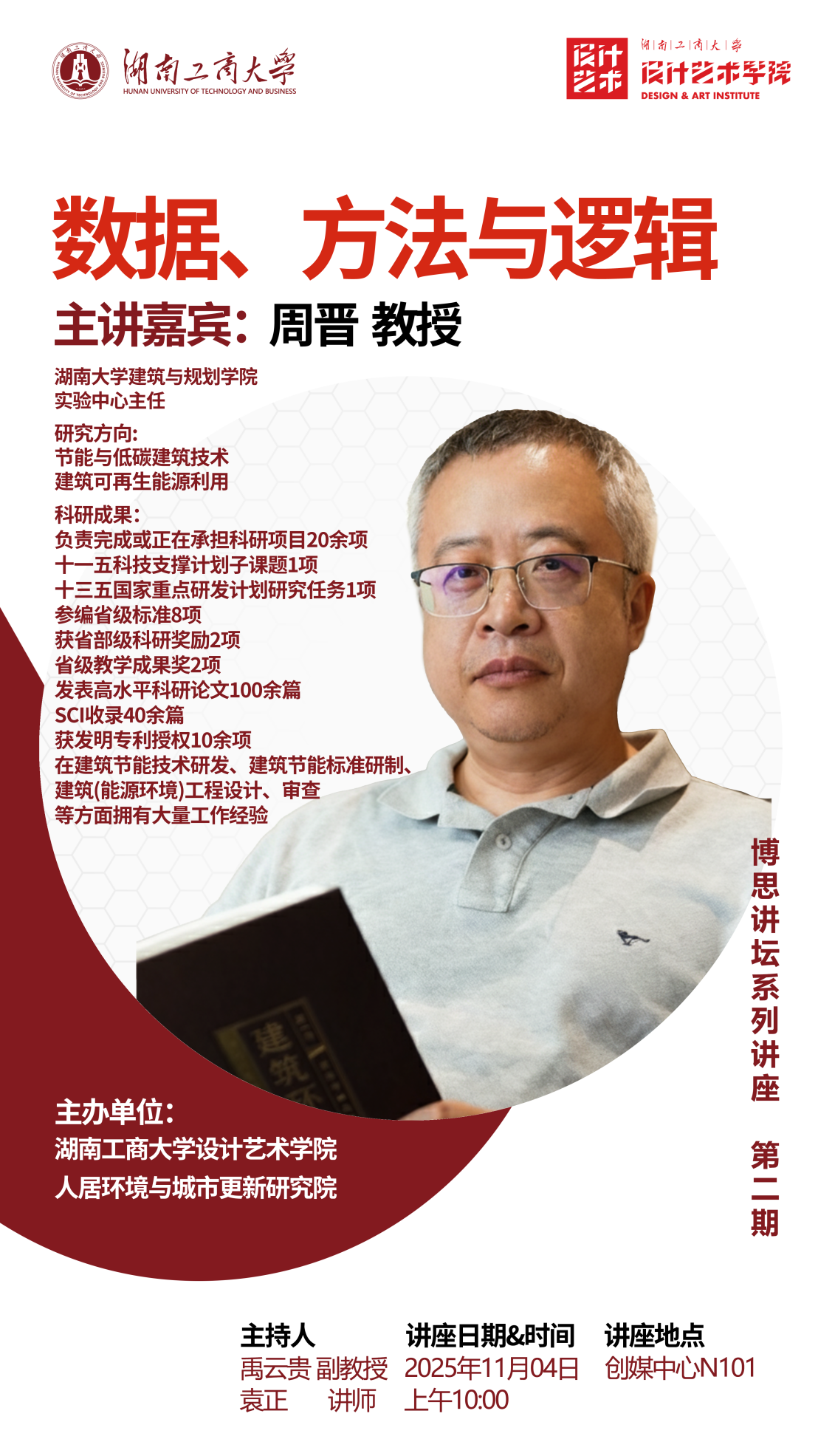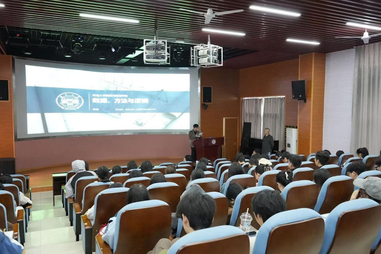 2025年11月4日上午,由湖南工商大学设计艺术学院、人居环境与城市更新研究院联合举办的第二期“博思讲坛”学术讲座在创媒中心N101顺利举行。本次讲座特邀湖南大学周晋教授担任主讲嘉宾,以“数据、方法与逻辑”为主题展开精彩分享。讲座由设计艺术学院禹云贵副院长主持。
