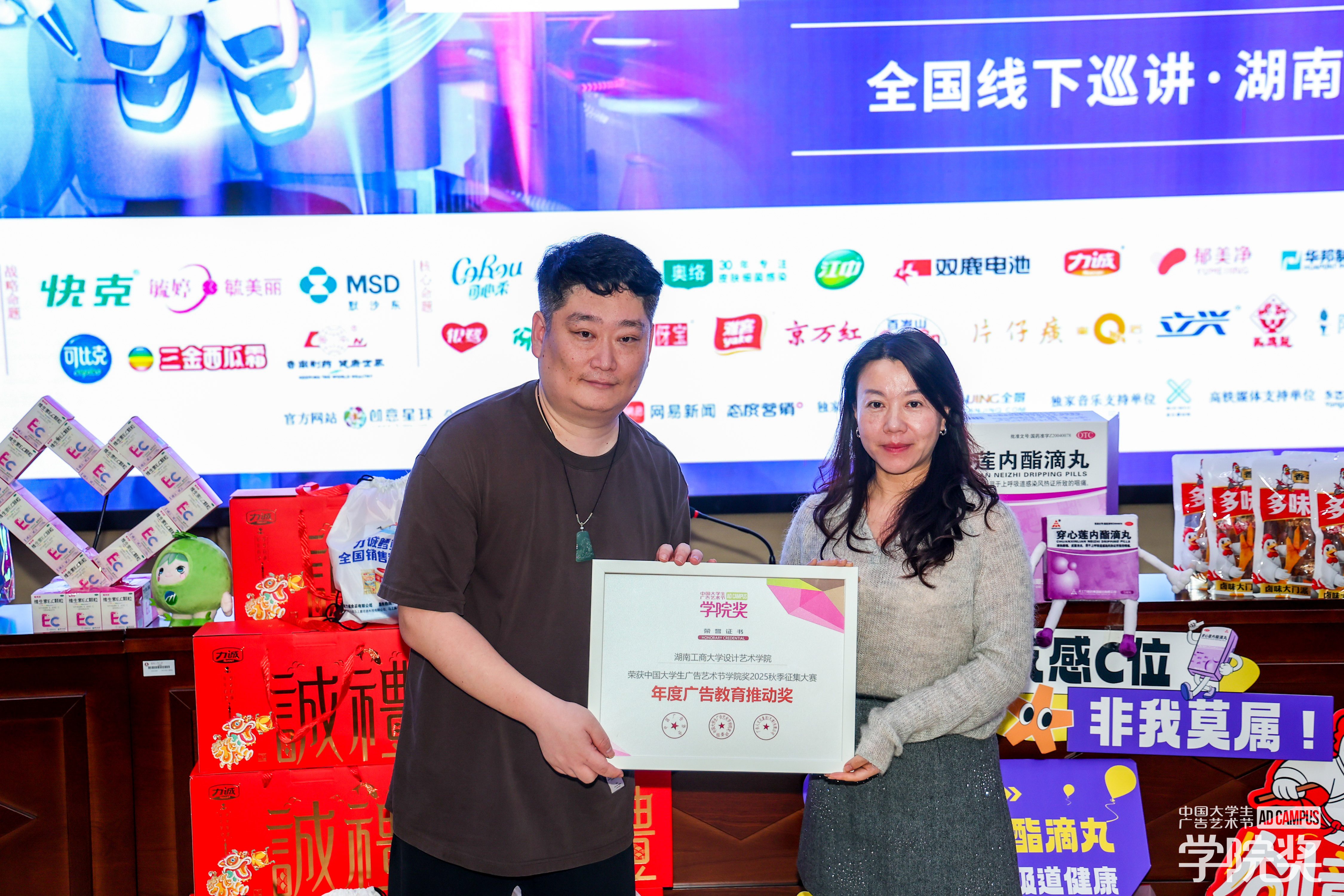 当天,我院学生工作办主任刘丽老师代表湖南工商大学设计艺术学院接受了学院奖组委会颁发的“年度广告教育推动奖”,广告人文化集团市场总监袁林先生代表组委会为校方颁发这一荣誉。