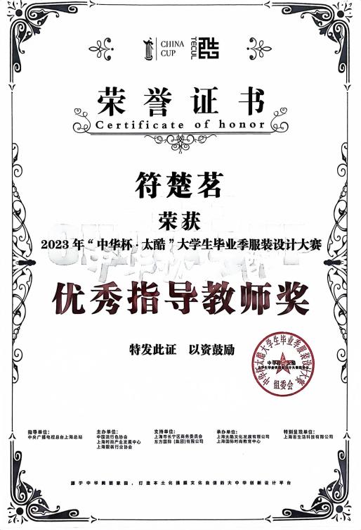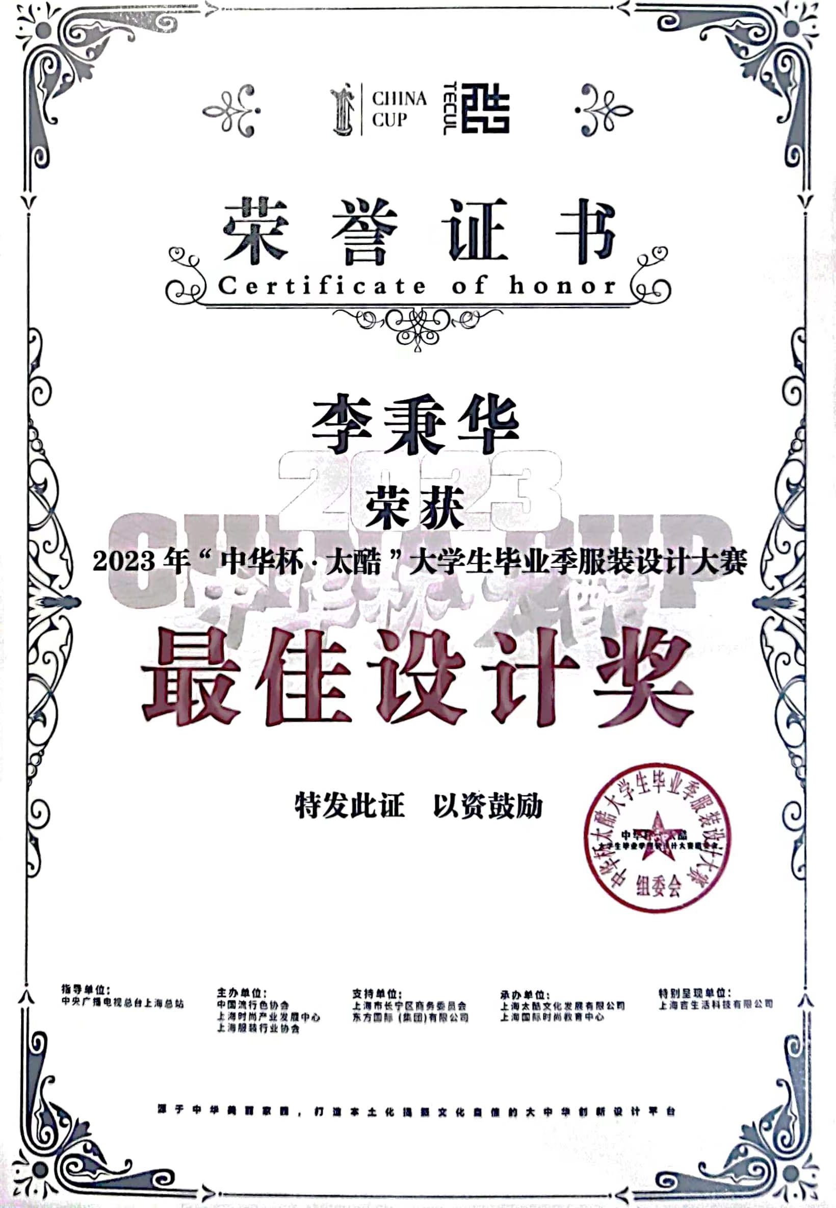 2023“中华杯•太酷”大学生毕业季服装设计大赛决赛暨颁奖典礼于3月27日晚在上海静安800秀举行。近千件大学生毕业设计作品,经过初评复评,于当晚角逐评出最终大奖。设计艺术学院服装1901班李秉华同学的“逐光而行”服装设计作品,在全国3000多份作品的选拔中脱颖而出,入围大赛总决赛并荣获“最佳设计奖”,其作品参与上海时装周和mode上海服装服饰展的展出,获得了上海电视台国际频道(ics)转发报道。其指导老师符楚茗获得“优秀指导教师奖”。此次获奖是继2022年设计艺术学院服装与服饰设计系1801班黄枝雨和李婧婷两位同学分获“大浪杯”中国女装设计大赛“最佳工艺奖和“中华杯•太酷”大学生毕业季服装设计大赛最佳设计奖后,服装与服饰设计专业学子再次斩获业界最高大奖。