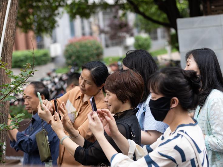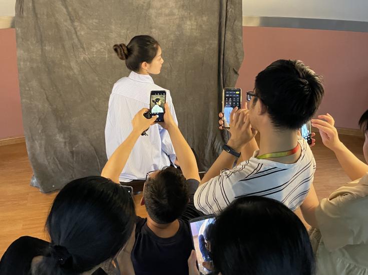 活动第一阶段为摄影实践环节。设计艺术学院郁剑教授深入浅出地为大家作手机人像摄影技巧理论讲解。接下来的现场实操,分别由设计艺术学院三位摄影经验丰富的教师带队,并邀请三位专业模特,选取岭南校区室内外多处风景进行人像实操拍摄。大家积极参与,并不时进行提问,体验专业摄影师的拍摄视角,尝试拍出摄影师风格的照片,和带队老师之间形成了友好的教学氛围。