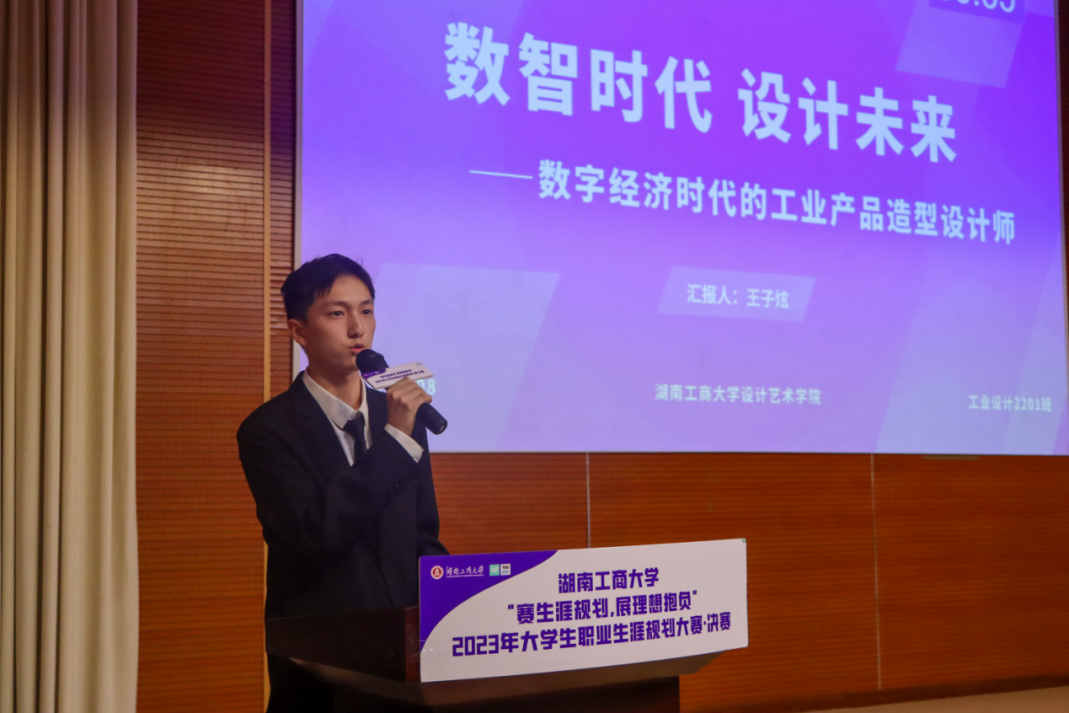 为加强大学生职业生涯规划意识,提升职业生涯的技能以及职业相关能力素质,树立正确的人生目标和就业观念,2023年大学生职业生涯规划大赛决赛6月8日晚在图书馆英才报告厅隆重举行。本次决赛环节评审分项目展示、职业探索和现场答辩(3分钟)三个部分,10名选手经学院初赛、训练营培训、选手作品以及专家评审等环节选拔成功入围本次大赛决赛。工业设计2201班的王子炫同学代表设计艺术学院成功跻身决赛。