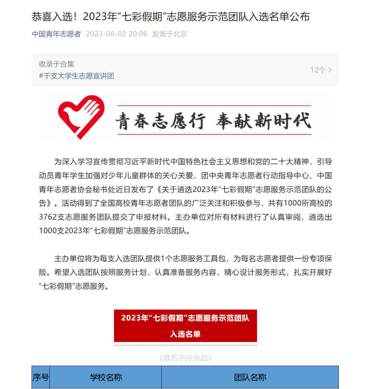 据悉,“七彩假期”志愿服务示范团队遴选活动是团中央青年志愿者行动指导中心、中国青年志愿者协会秘书处发起的一项志愿服务活动,旨在切实加强对农村留守儿童、城市随迁子女等少年儿童群体的关心关爱,以实际行动贯彻落实党的二十大精神。2023年全国共有1000所高校的3762支志愿服务团队报名参加,最终遴选出1000支“七彩假期”志愿服务示范团队。(文/李泽瑞)