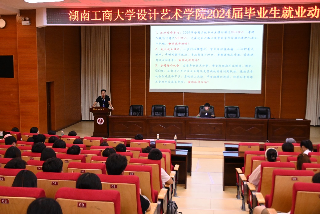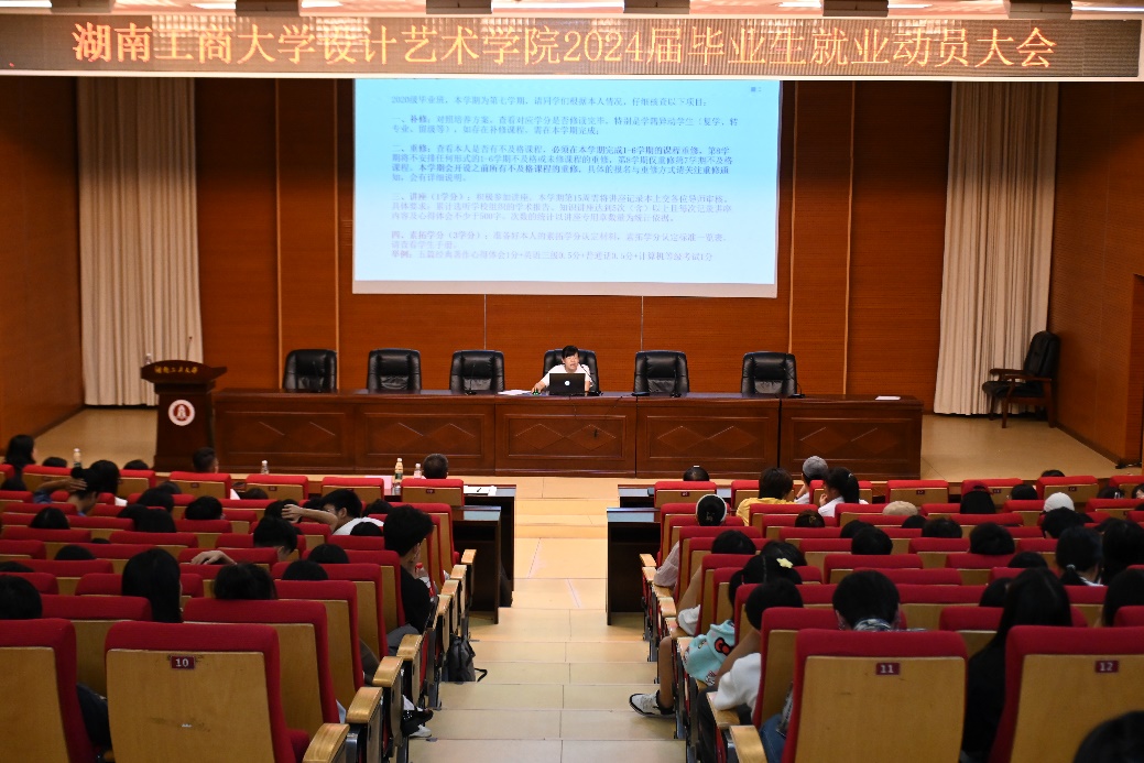 为了帮助2024届毕业生认清就业形势、树立正确的就业观念,更好地应对就业挑战,9月20日晚,设计艺术学院在图书馆英才报告厅召开2024届毕业生就业动员大会。招生就业指导处处长刘济波、设计艺术学院院领导、各专业系主任、毕业班辅导员、优秀校友以及2024届毕业生共同参会。设计艺术学院团委书记叶亚亚老师担任会议主持人。