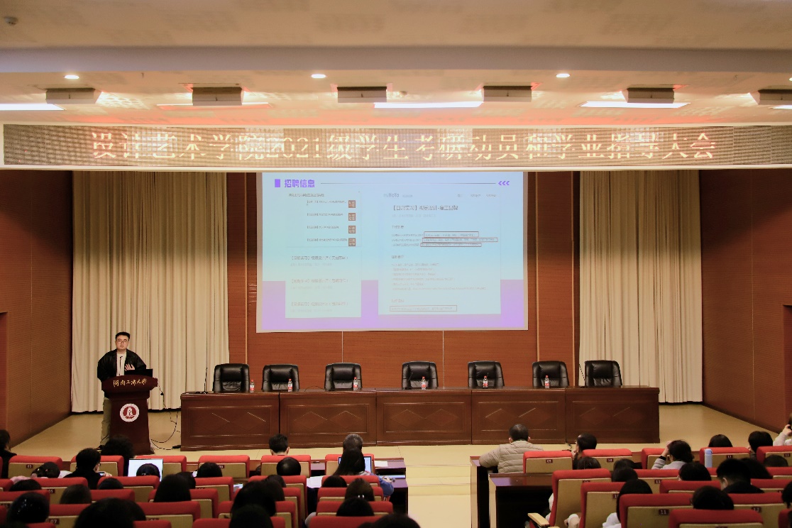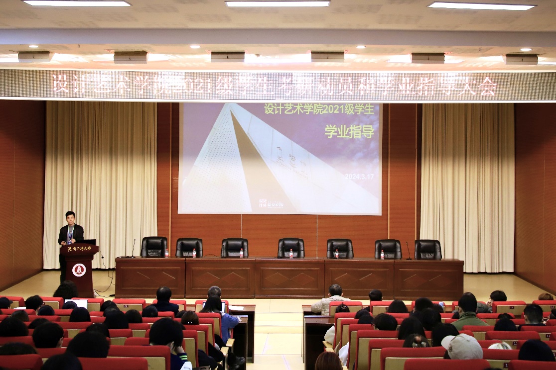 为充分调动学生的考研积极性,帮助学生深入了解考研现状和形式,3月17日下午,设计艺术学院在南校区图书馆英才报告厅举行了2021级学生考研动员和学业指导大会。学院领导班子、全体专任教师、副科级以上干部、2021级全体学生和辅导员参加本次会议。学院党委副书记陈鑫铭主持会议。