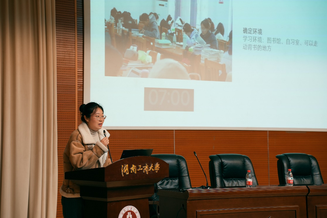 学院优秀研究生代表于晶同学和优秀本科生代表李泽昊同学分别以《脚踏实地仰望星空》和《倾听时代声音规划未来人生》为题,作考研上岸和高质量就业的经验分享。于晶同学详细介绍了自己的考研备考经历,提醒同学们要找准目标、合理规划、高效执行,同时分享了研究生期间的精彩生活,激励大家拼搏奋斗,争取早日上岸。李泽昊同学在刚刚结束的全国大学生职业规划大赛湖南赛区决赛上,斩获高教组就业赛道一等奖的佳绩,并在现场收获了4家企业提供的Offer,他结合个人实习和参赛经历,为同学们提供了丰富的就业规划建议,帮助大家提高求职成功率。