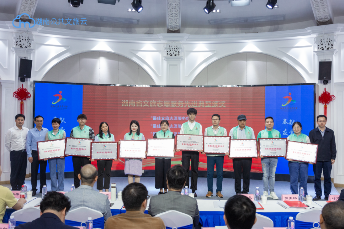 设计艺术学院党委副书记陈鑫铭代表学院接受湖南省文化和旅游厅颁发的“湖南省最佳文旅志愿服务组织”奖牌,学院团委书记杨杨、岳麓区青年志愿者联合会副会长颜梦杰受邀出席活动并于其他单位代表开展深入交流。