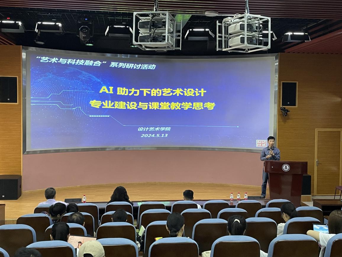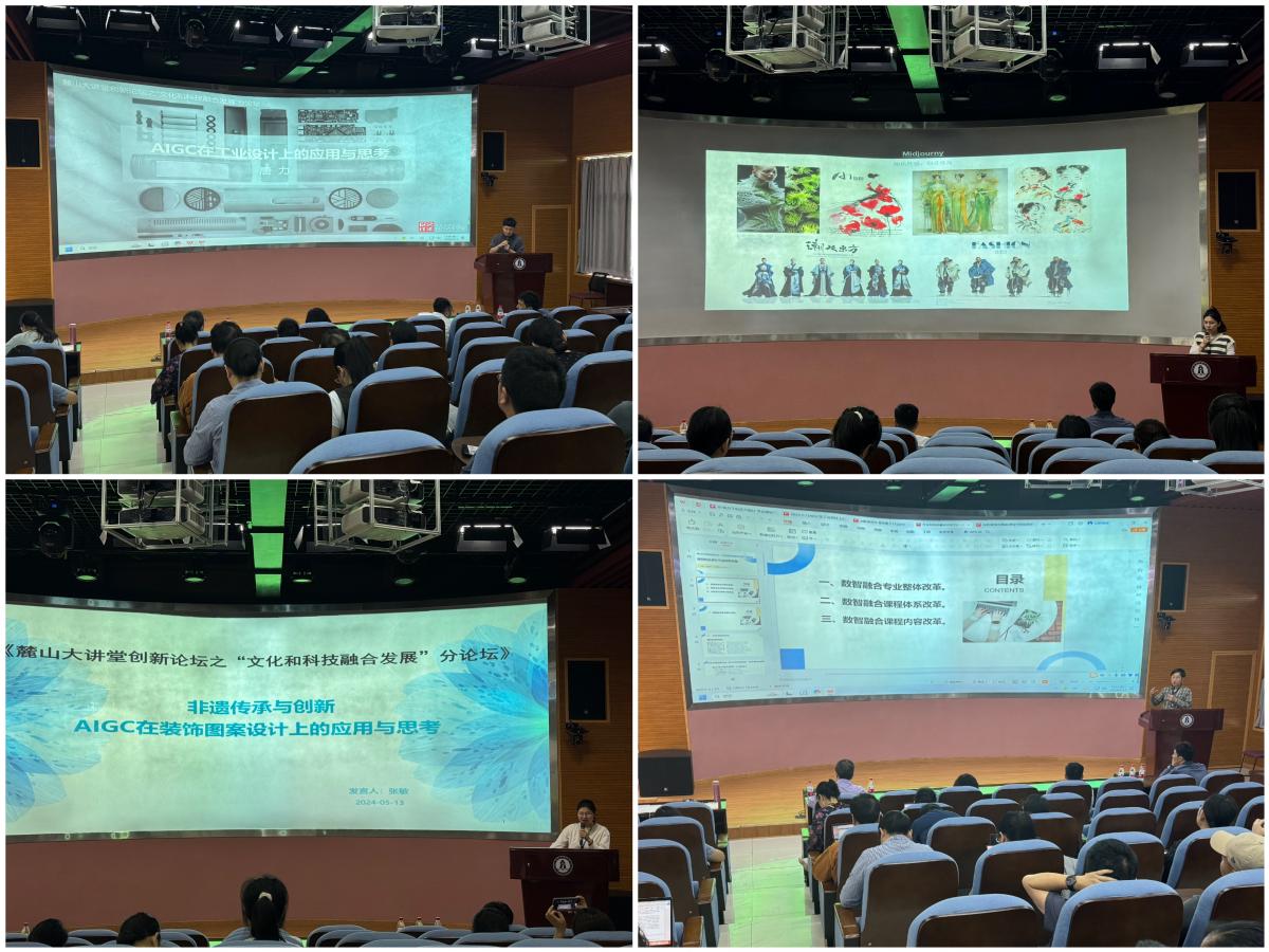 随后,多位专任教师也踊跃分享了各自的研究成果和见解。视觉传达设计系主任禹云贵副教授探讨了《视觉传达设计专业改革思路》,详细介绍了数智融合背景下如何对专业、课程体系、课程内容进行改革;工业设计系主任唐力老师结合具体案例,阐述了《AIGC在工业设计上的应用与思考》,验证了目前AIGC技术在工业设计流程中的应用程度;服装与服饰设计系的蒋多妮老师则分享了《AIGC服装设计》的实践经验,探讨了如何借助AI工具,如ChatGPT辅助Midjourney,在服装设计中的实际应用;环境设计系的张敏副教授则带来了《非遗传承与创新:AIGC在装饰图案设计上的应用与思考》的分享,她坚信AI与传统文化的结合能为传统文化的传承与发展注入新的活力;此外,工业设计系副系主任雷劝老师则从实践应用的角度出发,深入剖析了《科文融合·文化与科技在商业中的应用》,详细探讨了校企合作、人才培养以及人工智能技术在实际商业场景中的落地与应用空间。