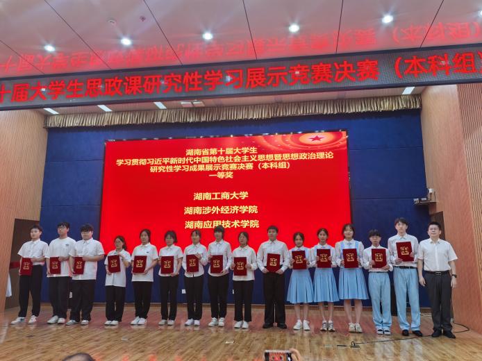 6月1日上午,由湖南省教育厅主办、湖南工业大学承办的湖南省第十届大学生学习贯彻习近平新时代中国特色社会主义思想暨思想政治理论课研究性学习成果展示竞赛决赛(本科组)在湖南工业大学圆满落幕。经过激烈角逐,由我院工业设计专业王子炫、陈宁、颜研、蒋丽萍、刘佳怡五位同学组成的湖南工商大学代表队荣获决赛一等奖的好成绩。