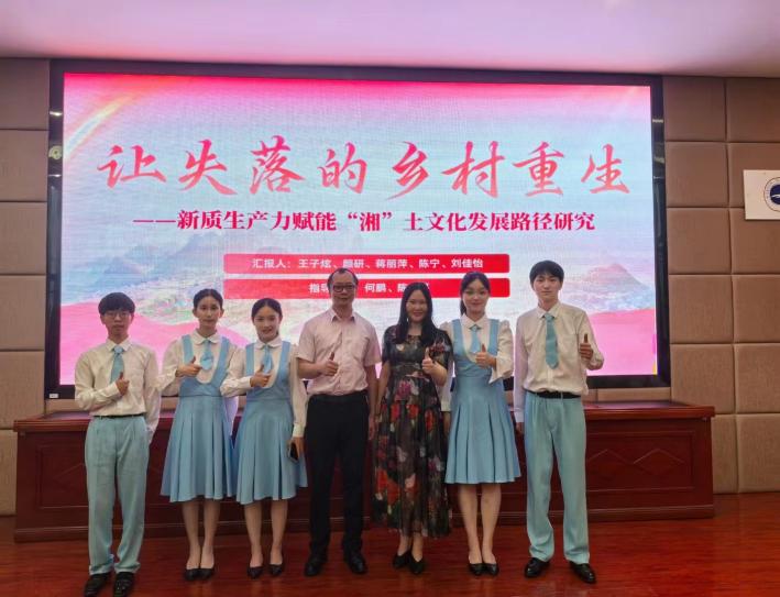 依托本学期在修的《中国近代史纲要》课程,团队5位成员在马克思主义学院何鹏老师的指导下组建了思想政治理论课研究性学习小组,随后又力邀马院陈立平老师加入指导组。在两位老师的悉心指导下,团队以《让失落的乡村重生——新质生产力赋能“湘”土文化发展路径研究》为研究主题,开展了扎实有效的研究性学习和成果展示备赛工作。在历时两个多月的学校初赛和全省复赛中脱颖而出,成功代表学校跻身决赛,在全省38所本科院校提交的万余份成果中过关斩将收获一等奖。