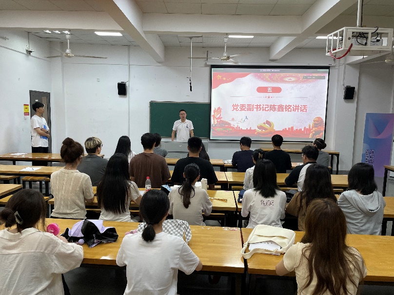 设计艺术学院党委副书记陈鑫铭老师发表重要讲话。他首先向新加入党组织的预备党员表示热烈的祝贺,并提出了殷切期望。陈书记希望预备党员们能够在日常生活和学习中,以身作则,成为同学们的楷模,引领周围的人共同进步。他特别强调,入党宣誓是共产党员的重要政治仪式,它不仅标志着党员政治生涯的新起点,更是对党作出庄严承诺的时刻。他勉励每位预备党员要牢记入党誓词,以实际行动践行自己的誓言,始终保持对党的忠诚和对人民的热爱,不辜负时代的重托和青春的岁月。