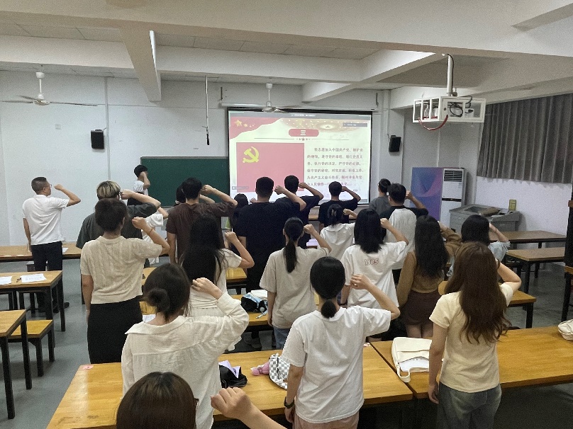 紧接着,由教工党支部的史高帅同志领誓,全体预备党员面对党旗进行了庄严的宣誓。他们郑重地举起右手,向党旗许下坚定的承诺,表达了他们为共产主义事业奋斗终身的决心。铮铮誓言,字字千钧,透露出预备党员们的坚定信仰和为人民服务的真挚情感。