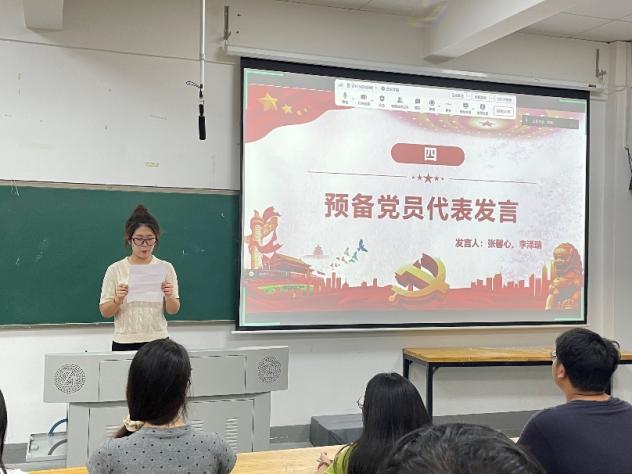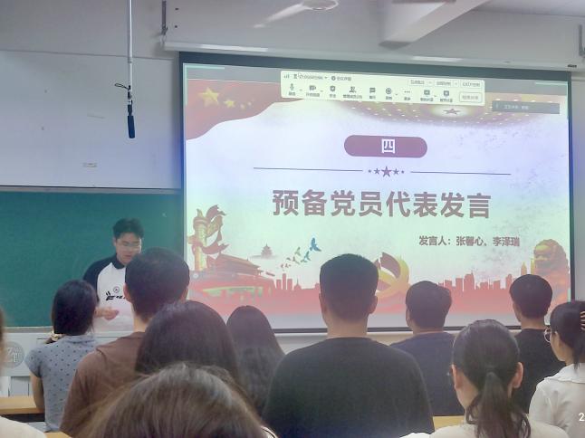 宣誓过后,预备党员代表张馨心和李泽瑞分别上台发言。他们深情回顾了自己的入党心路历程,分享了对党的深刻理解和未来的奋斗目标。两位代表均表示,在未来的学习和工作中,将以党员的标准严格要求自己,不断坚定共产主义信仰,充分发挥先锋模范作用,力争早日成为正式党员。