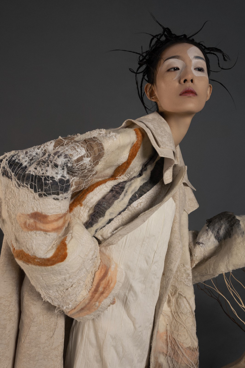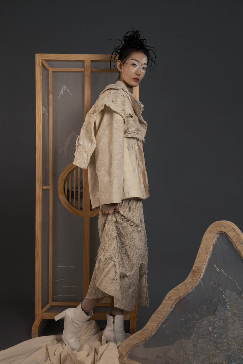 作品简介:本设计灵感来源于古法造纸,以贵州石桥古法造纸为出发点进行设计,从工艺、色彩、文化等角度,对古法造纸元素研究提取再创,通过实验制作运用到女装设计中,结合艺术手法羊毛湿毡、针毡、植物染等工艺和麻纱、棉麻等材料进行面料改造,围绕低碳环保的设计理念,环境保护减少污染浪费的呼吁和传统文化的传承和创新。