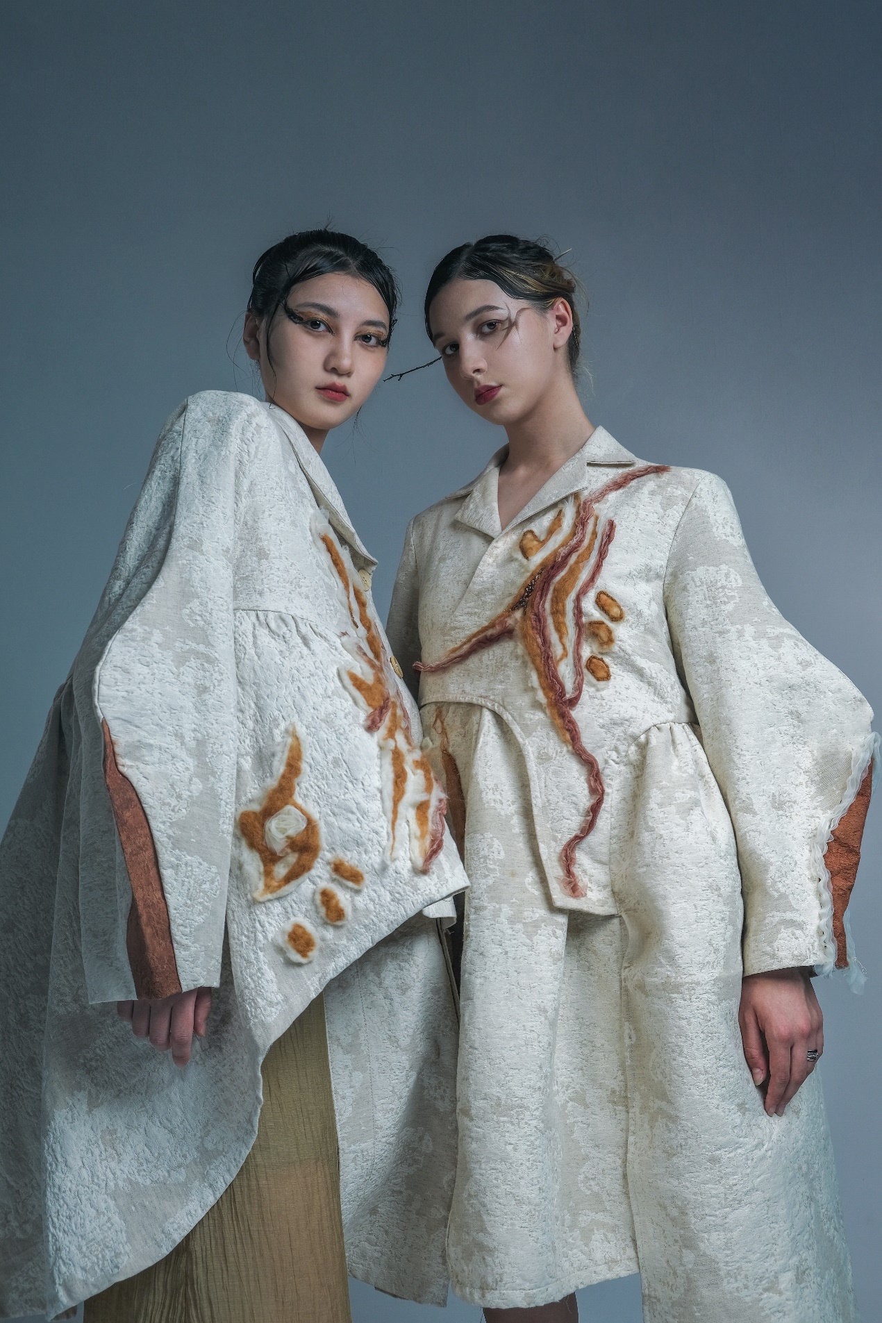 作品简介:本次创作的设计围绕女书的所蕴含的精神内涵以及审美价值,在面料、工艺、色彩和廓形方面进行设计。通过对女书文字符号以及将神内涵的分析和提取,其进行图形化设计,应用于服装的图案和纹理中。通过羊毛毡对女书图案的表达,增加服装的氛围感。这不仅是女书文字符号运用的创新,也是对现代设计手法和民族文化艺术结合的探索。