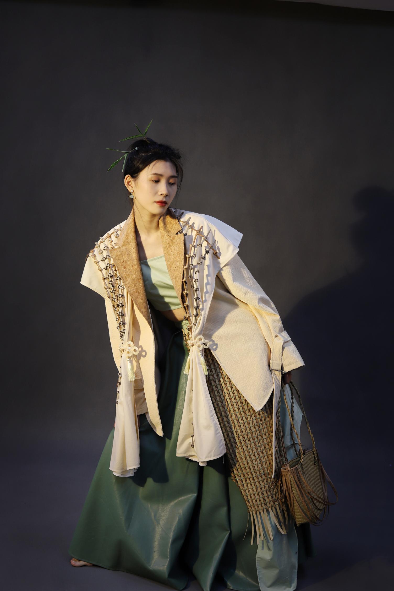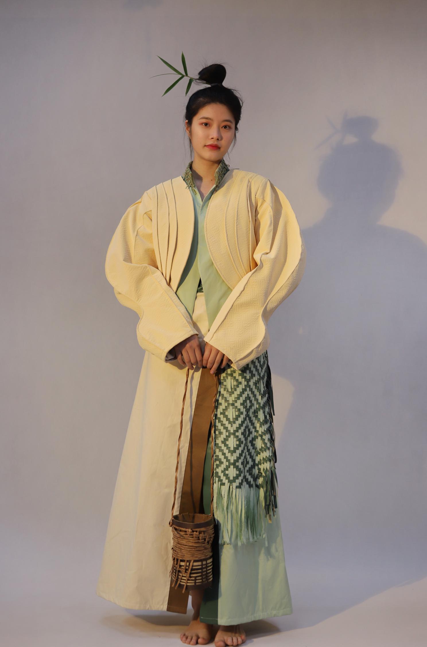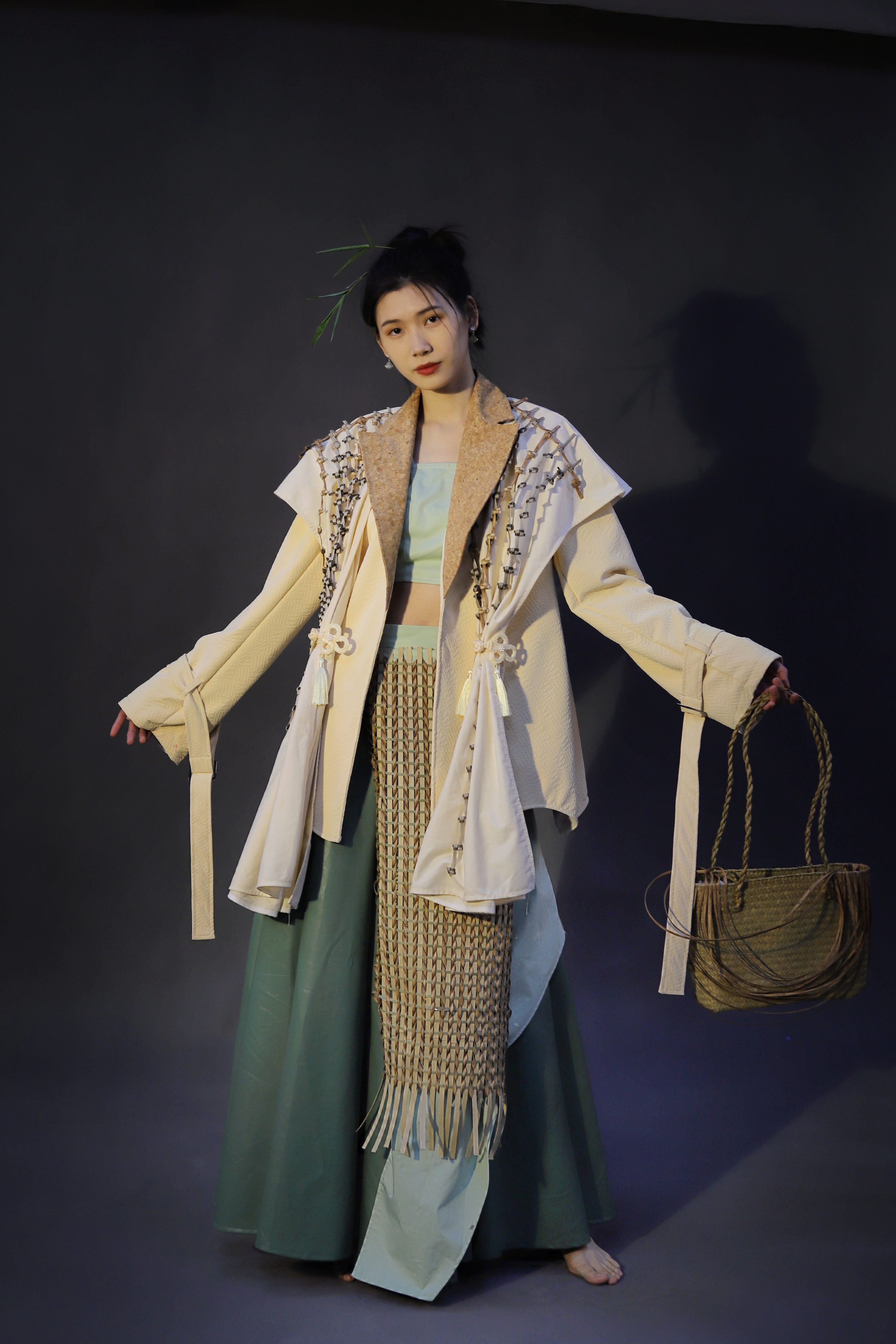作品简介:本设计以湘西竹编图案为载体,将湘西竹编工艺的韧与面料的柔相互结合,用面料编织竹编图案的形式体现竹编的灵活可塑性。在柔软的面料中湘西竹编图案被赋予新的表现方式,韧中有柔,柔中带韧,中国湘西竹编图案得以传承和创新。