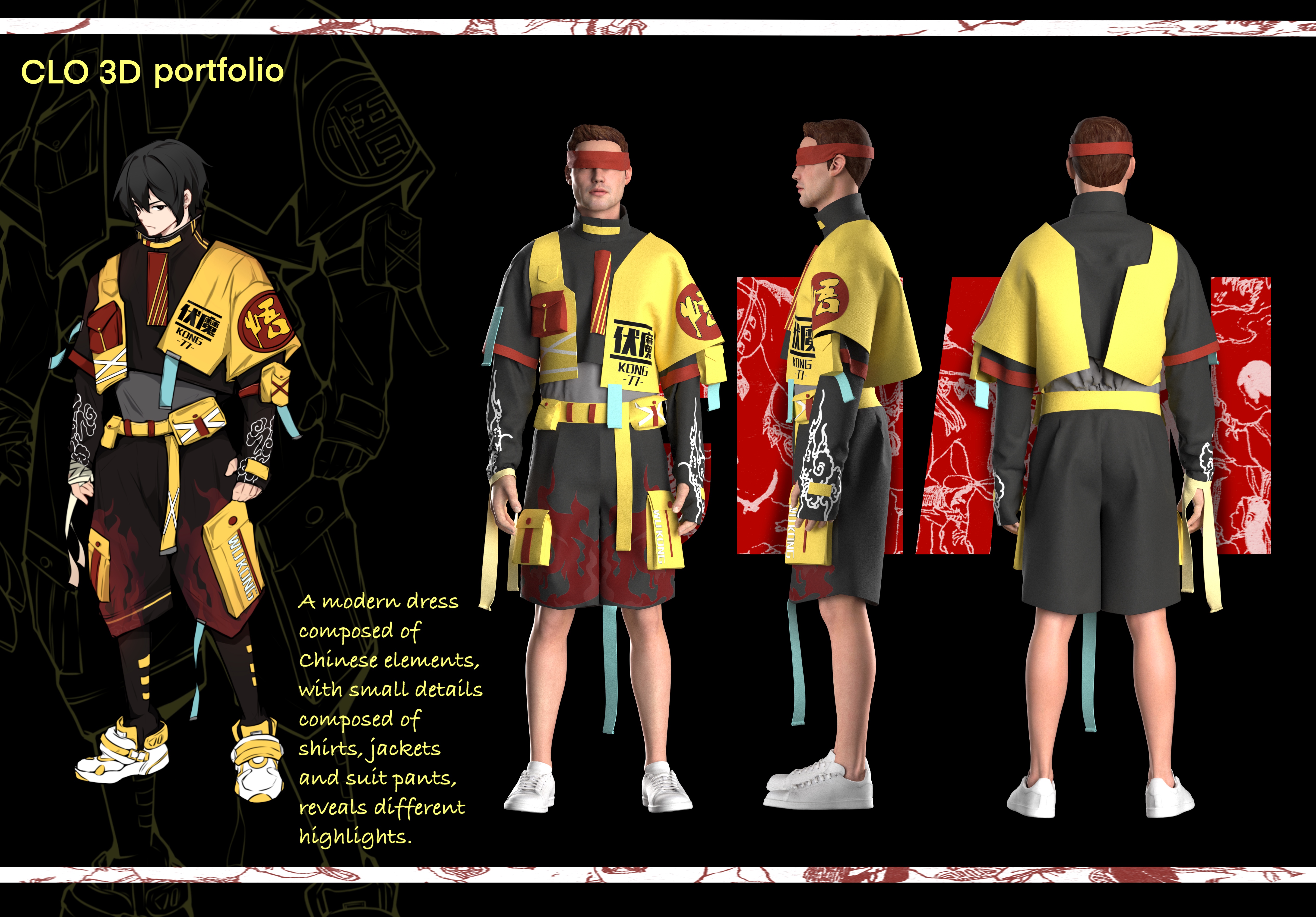 作品简介:将西游故事中的五人特点和服饰与国潮和赛博朋克相结合,突破以往的刻板印象,呈现出截然不同的视觉效果,使西游记中的人物融合朋克元素重回当代国潮设计中。朋克西游与国潮相融合,符合现代时尚的审美,顺应社会的流行趋势,具有独创性和流行性。