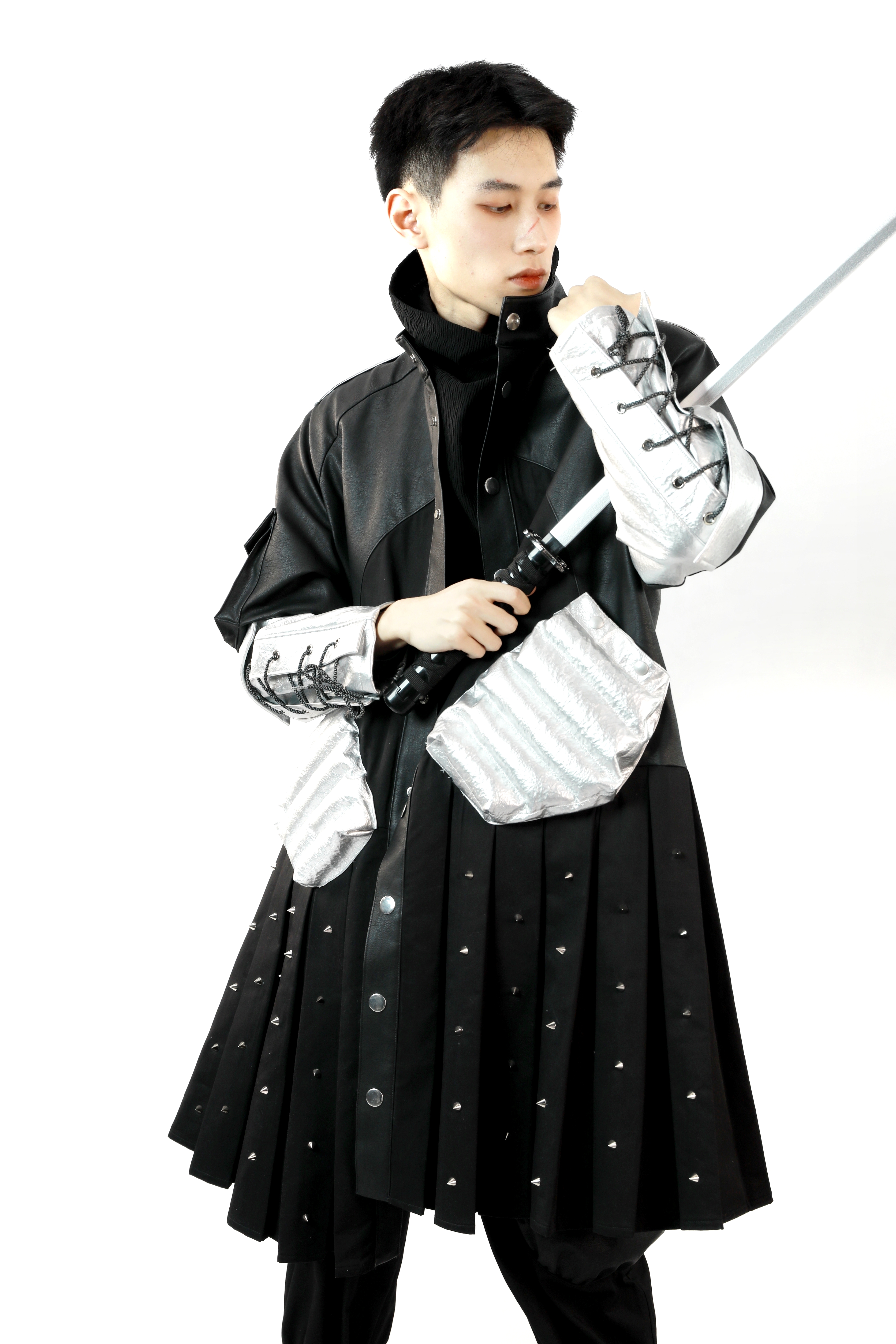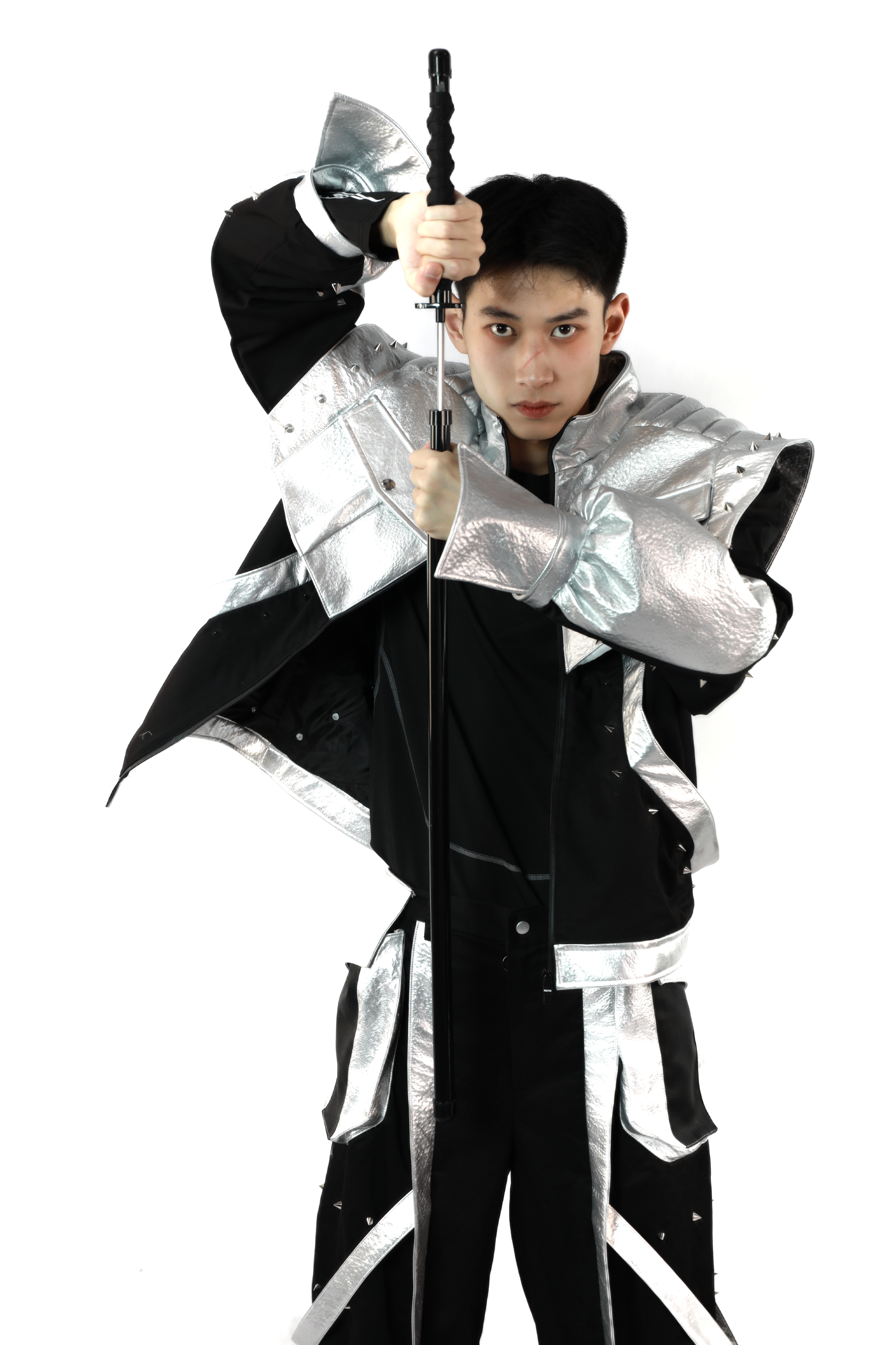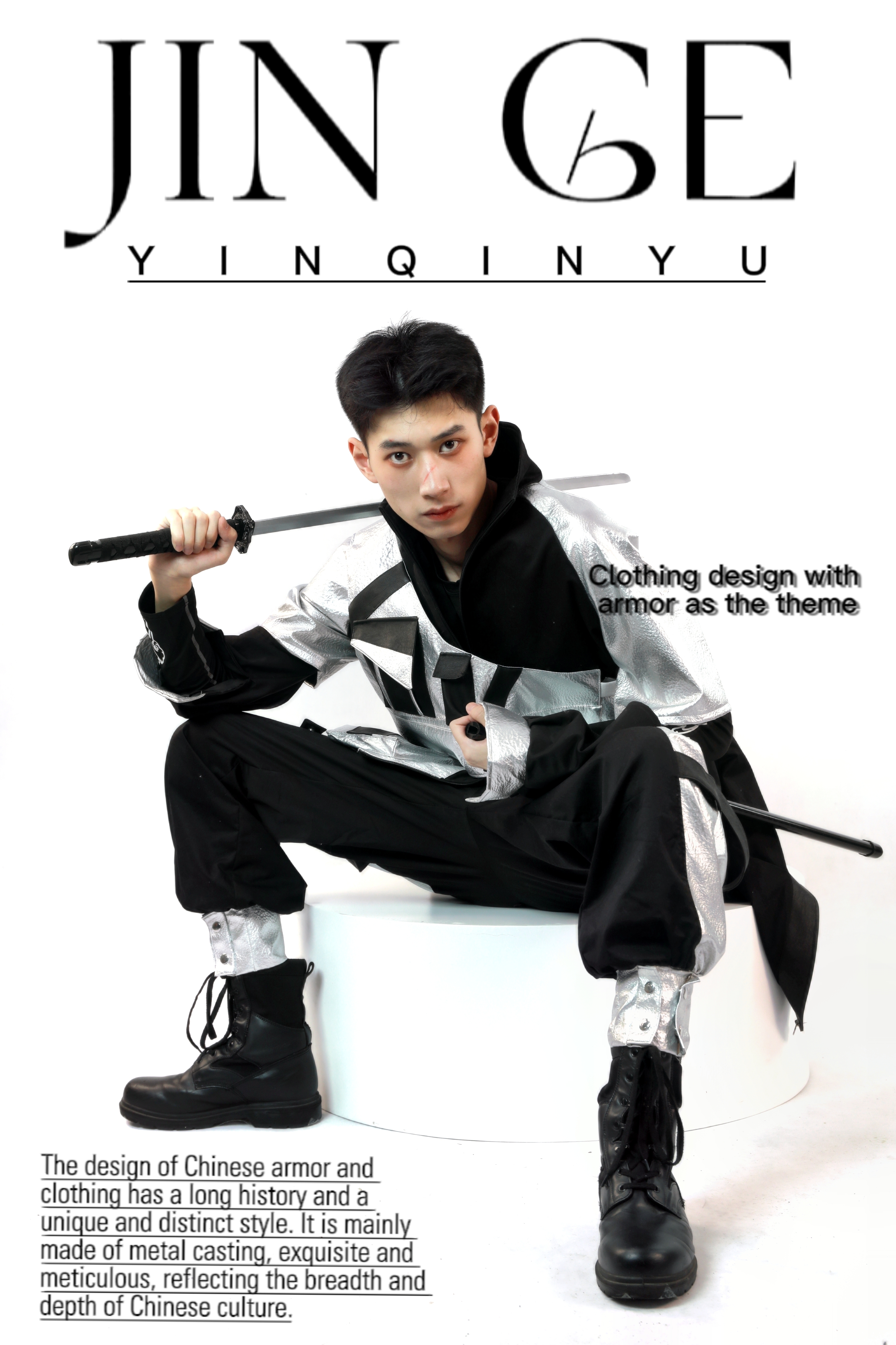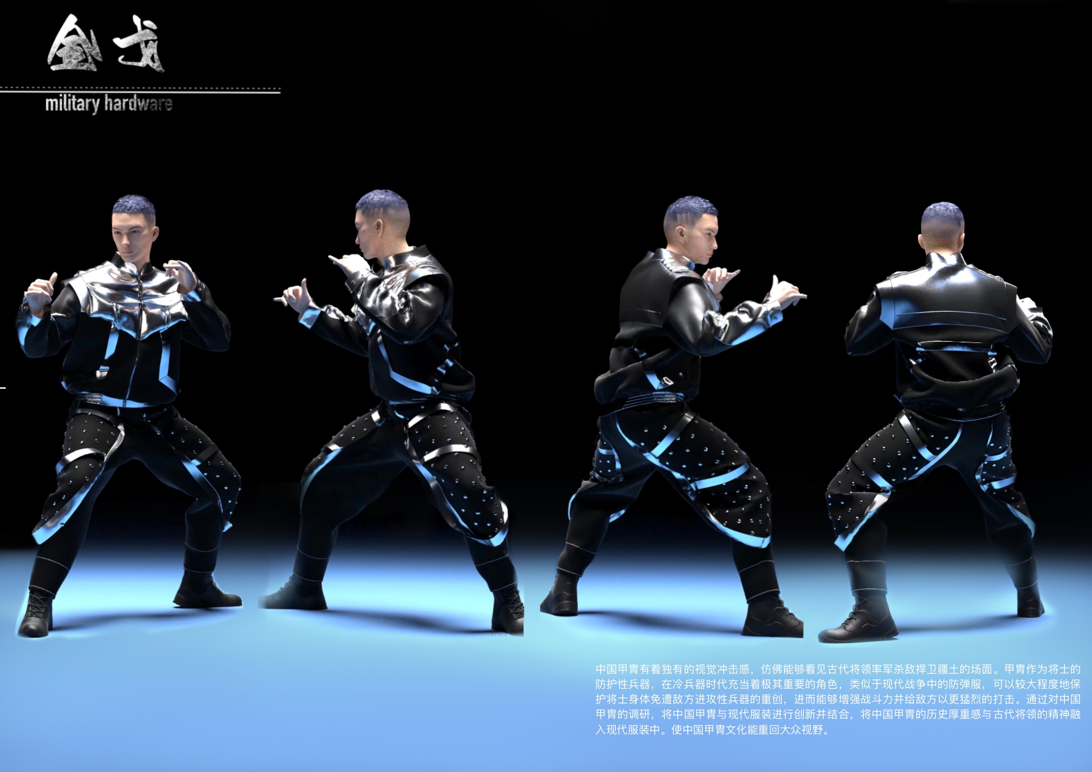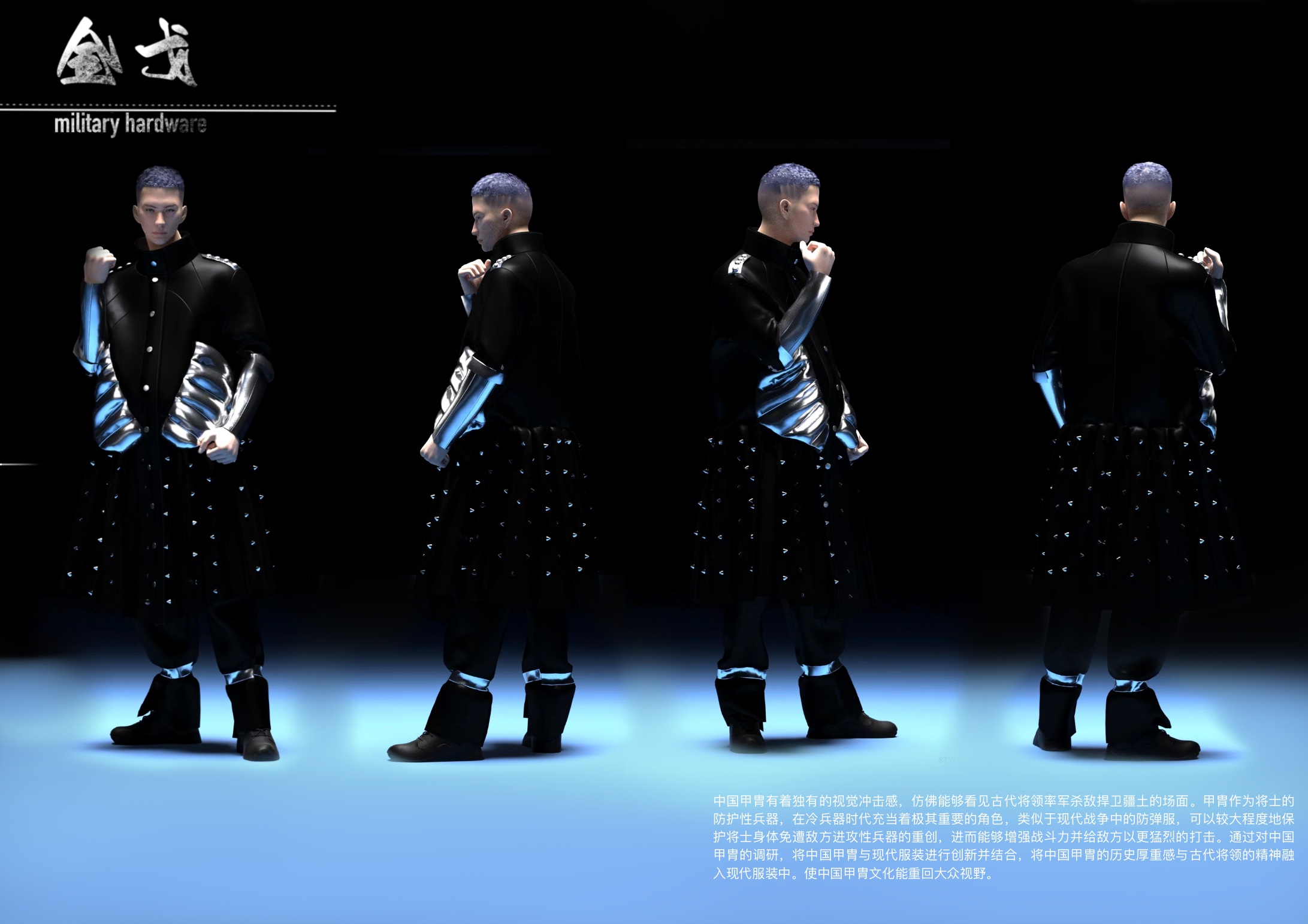 作品简介:中国的甲胃是指铠甲和头盔,它们在中国文化中有着重要的地位。在古代甲胄被视为一种重要的防御性服装,并且能够有效地减少敌方武器对士兵的伤害。进而减轻己方将士伤亡,良好的甲胃往往可以提高凯旋的可能,现如今中国甲胃广泛应用于各设计领域,同时也成为了服装设计师的设计元素。本次设计将中国甲胄工艺应用于现代服装设计中,将中国甲胃甲片元素提取更换材料进行排列应用到现代服饰当中,将中国甲胃的防护特点与庄重威严感带入到现代服装设计中。