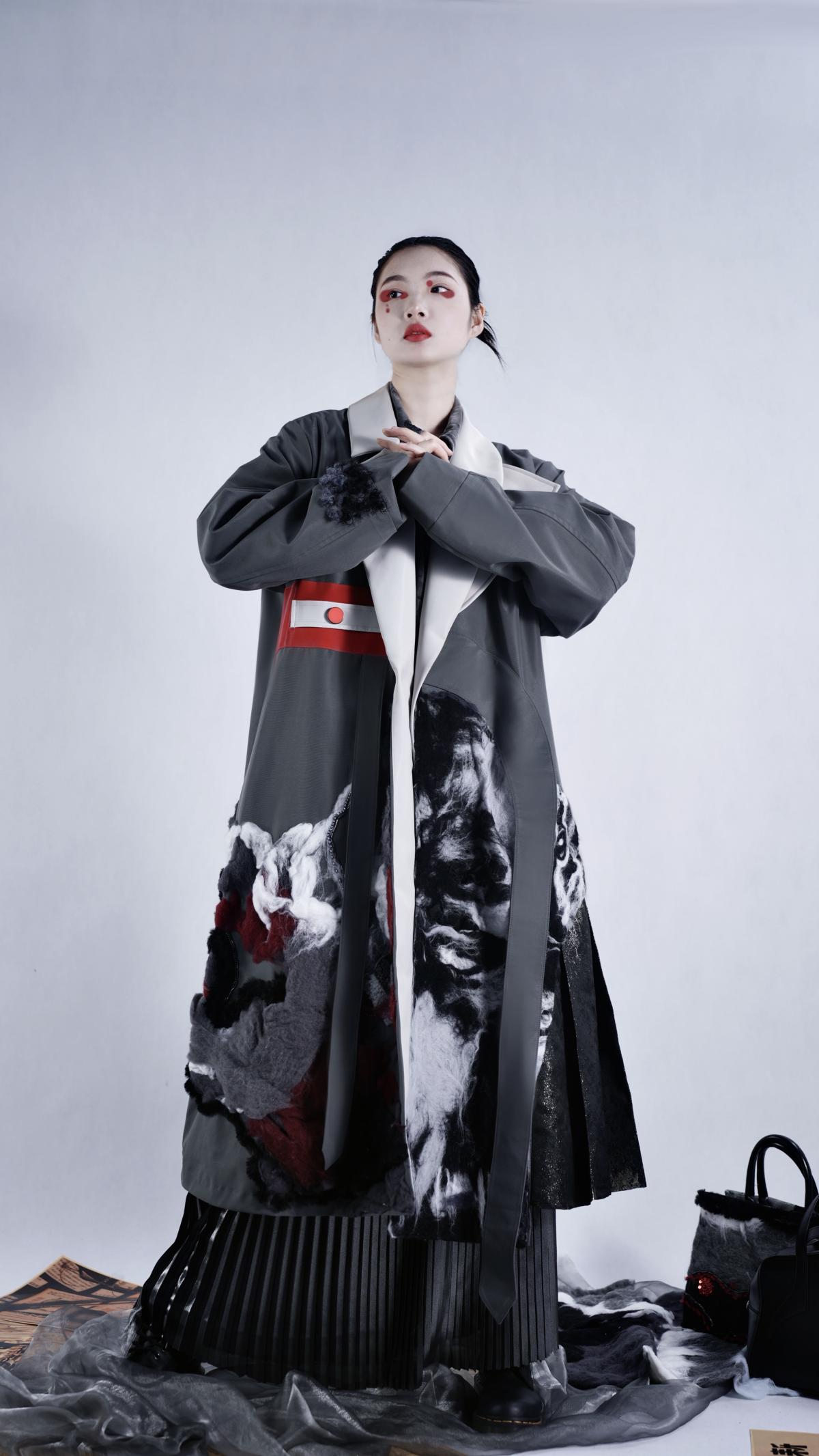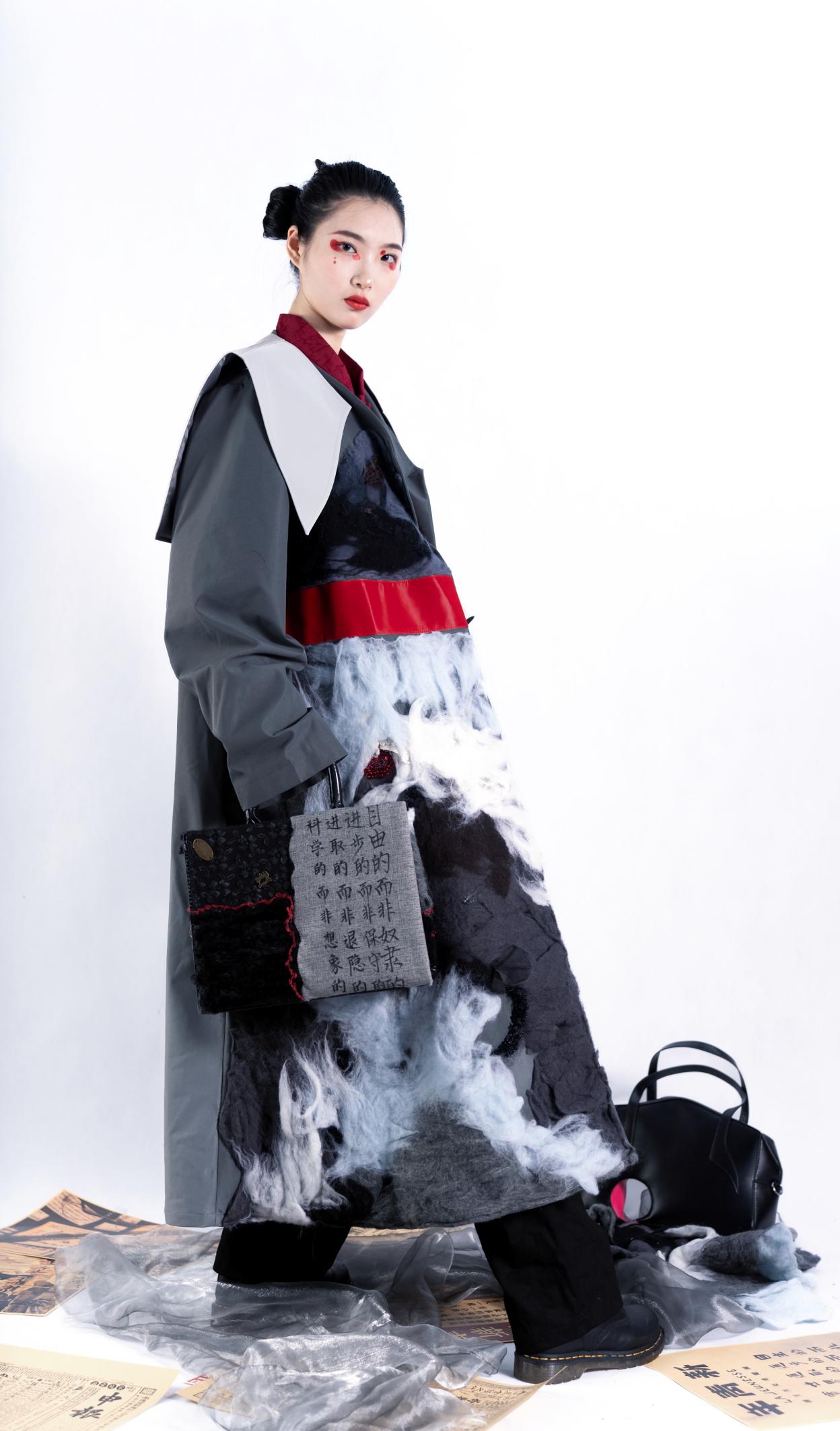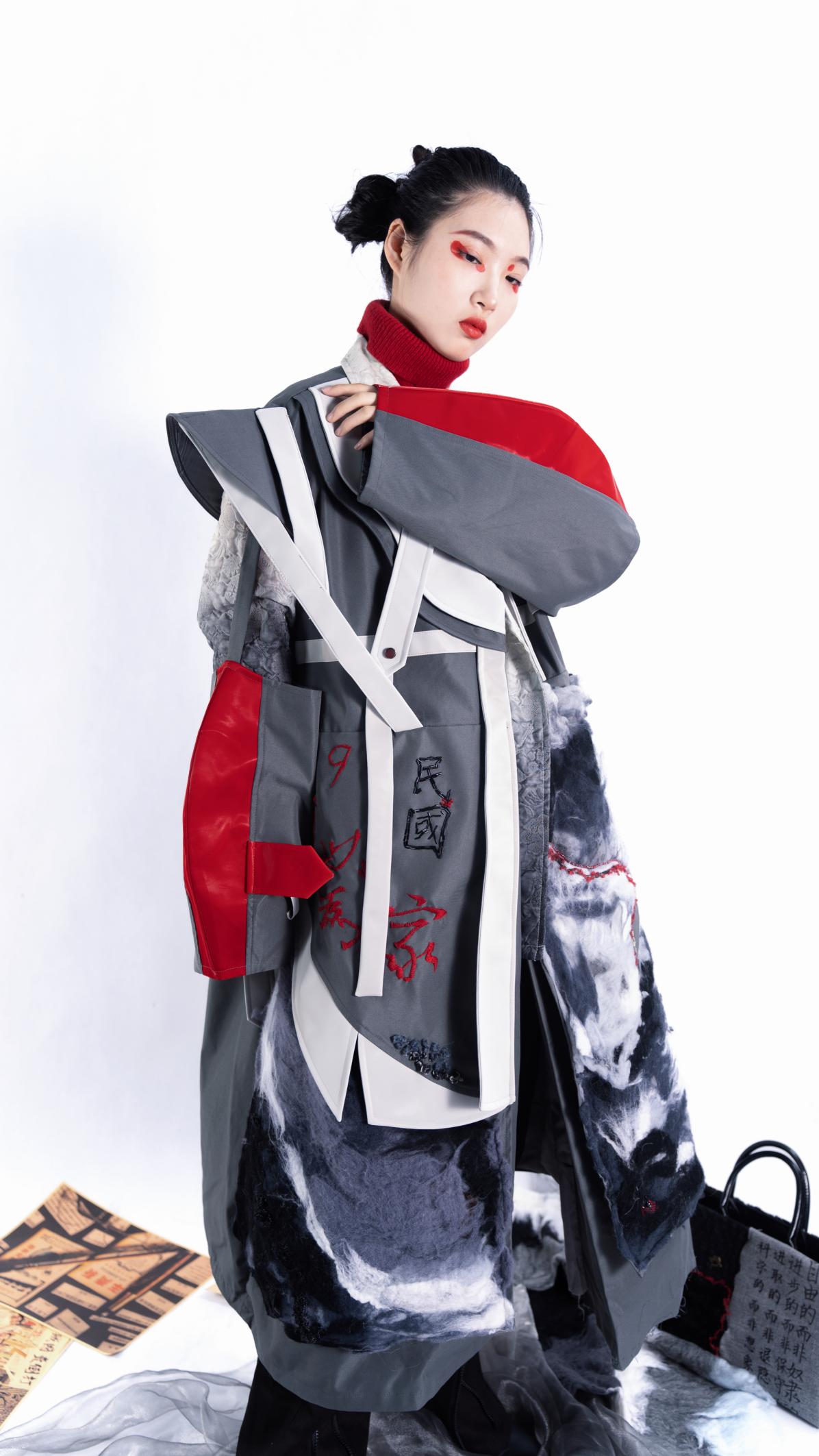 作品简介:本次系列作品将五四青年运动元素融入当代青年服装设计,在新的历史条件下,当代青年要进一步弘扬五四精神,始终高举爱国主义旗帜,激发我们青年思潮的觉醒与交流。本次设计的目的是使当代青年与五四运动精神之间产生共鸣与互动,在现代服装设计中结合五四运动特有元素与流行元素,激发当代青年对民族的炽爱以及时代意识的觉醒。