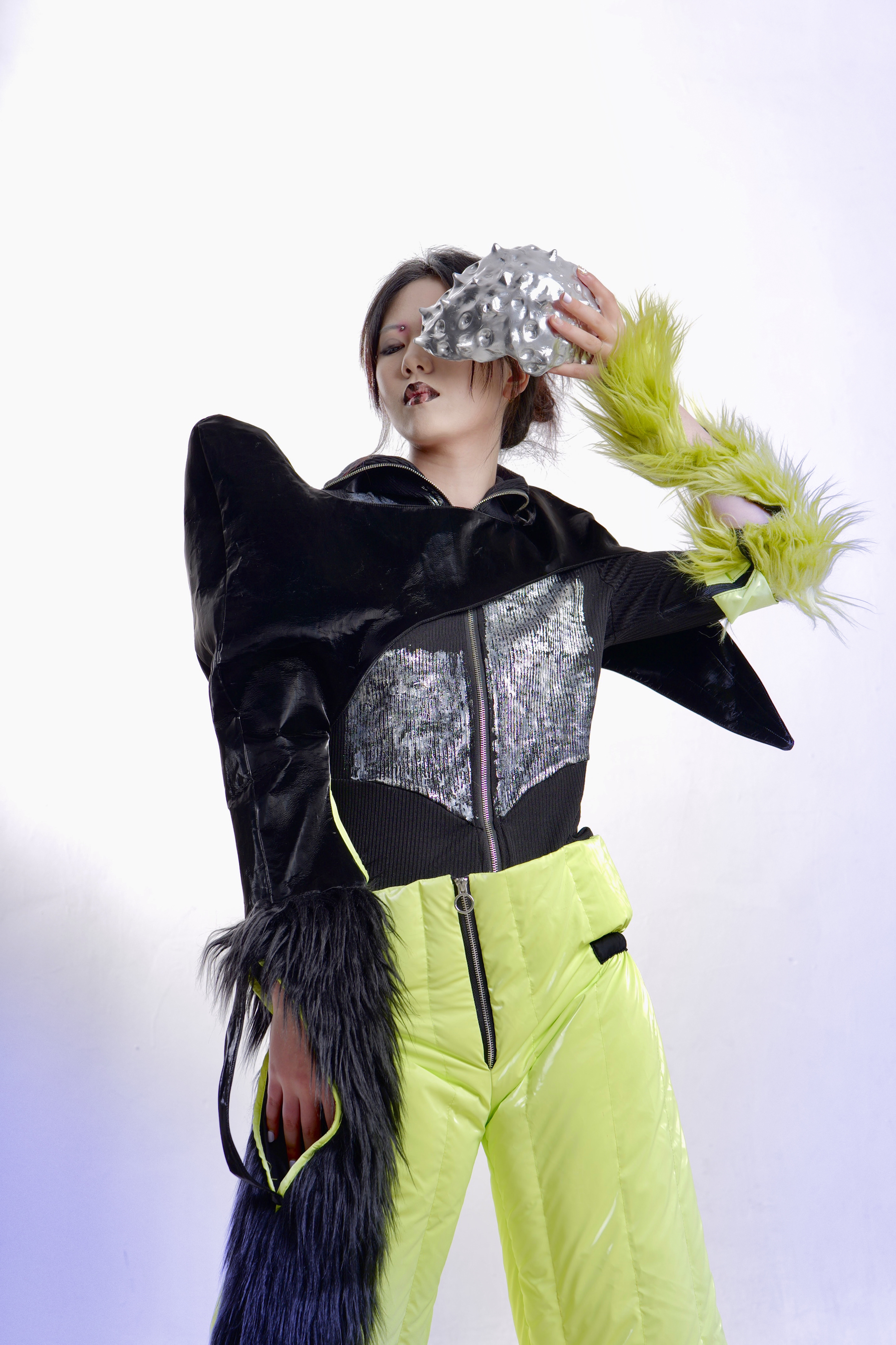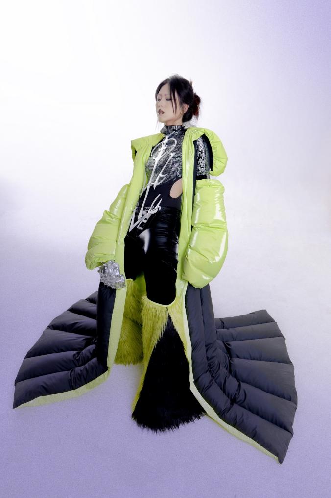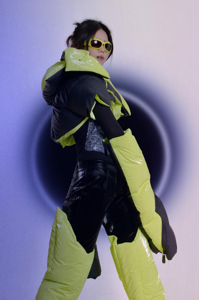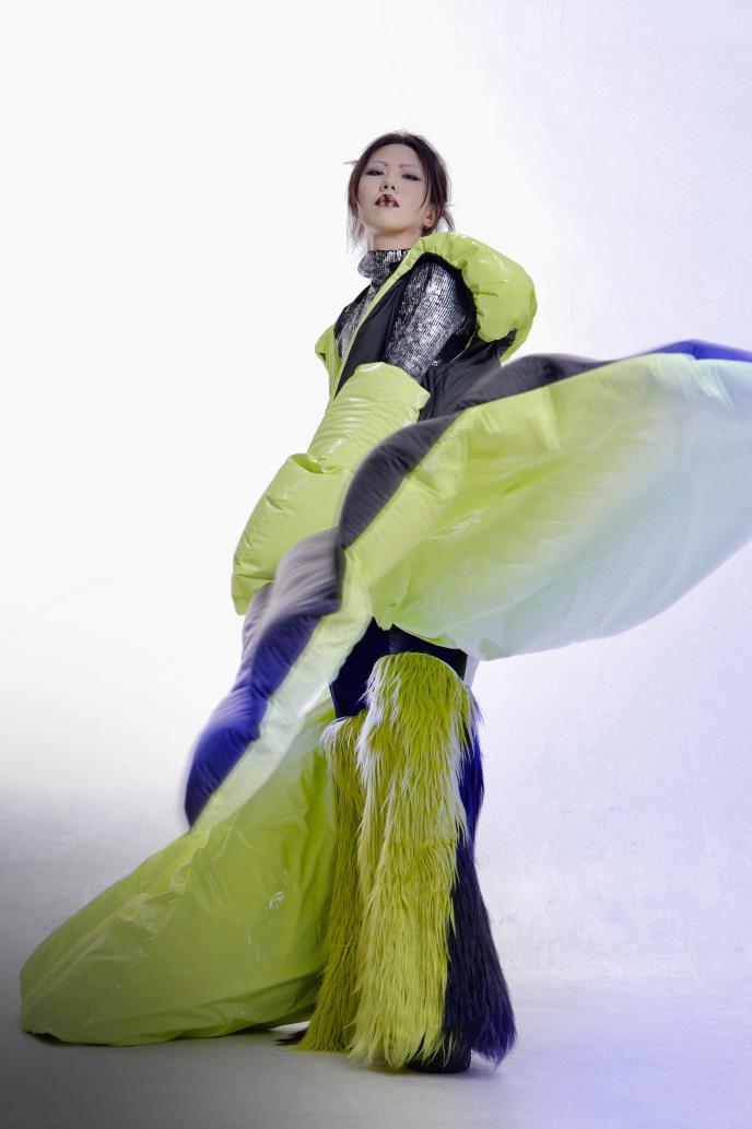 作品简介:本设计结合清代夔龙纹和未来感服装,在科技飞速发展的时代溯源历史,进行一场跨时空交流。利用清代夔龙纹的图案设色等元素融合未来主义服装的性质,主要结合未来主义反光材质为主,大面积填充羽绒,毛绒面料为辅,eva材料和自由树脂可塑土制作清代夔龙纹图案,与烫金转印的针织产生强烈对比进行设计,追溯过去并向往未来。