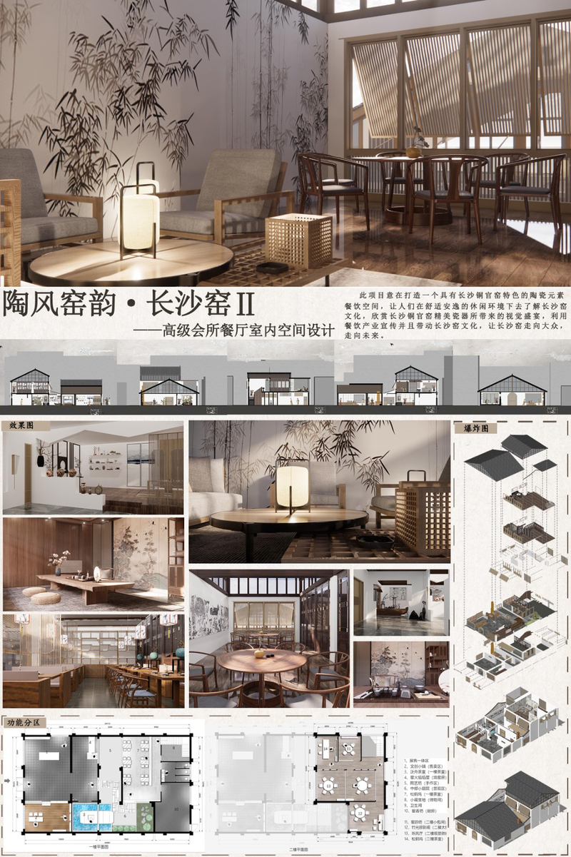 作品简介:此项目围绕非遗传承的设计主题,意在打造一个具有长沙窑特色的陶瓷元素餐饮空间,让人们在舒适安逸的休闲环境下去了解长沙窑文化,利用餐饮产业宣传并且带动长沙窑文化,让长沙窑走向大众,走向未来。