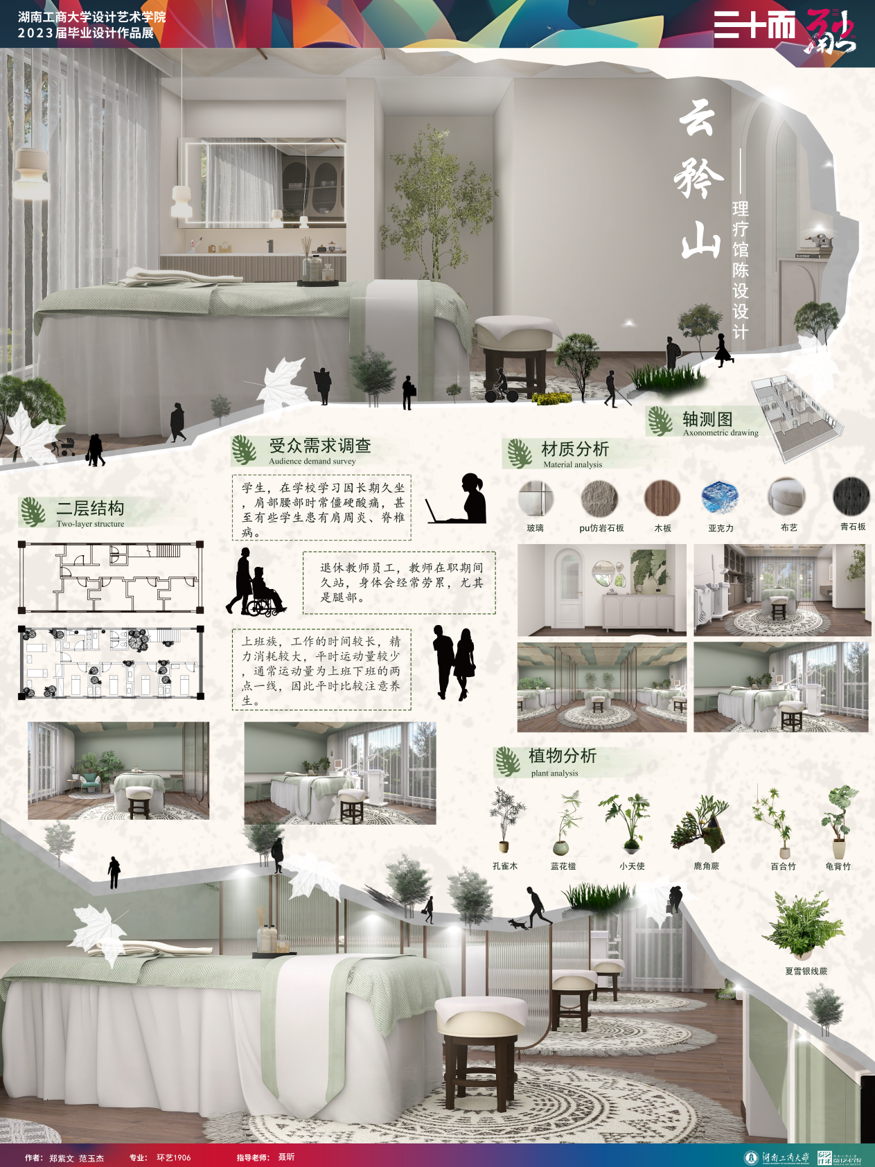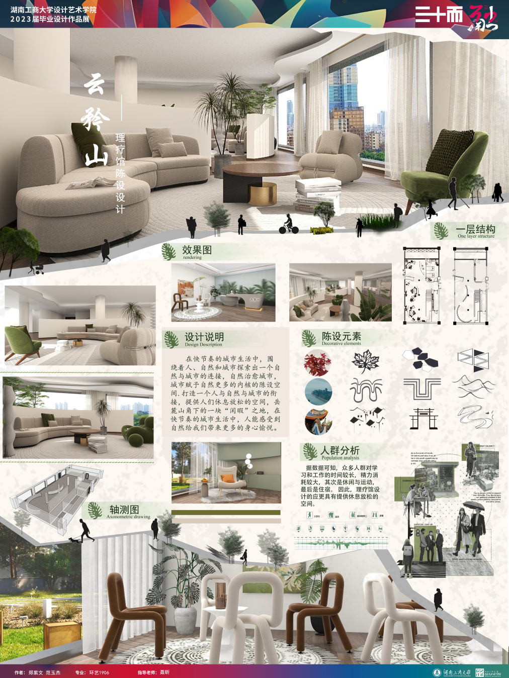 作品简介:在快节奏的城市生活中,围绕着人、自然和城市探索出一个自然与城市的连接,自然治愈城市,城市赋予自然更多的内核的陈设空间.打造一个人与自然与城市的衔接,提供人们休息放松的空间,岳麓山角下的一块“闲暇”之地,在快节奏的城市生活中,人能感受到自然给我们带来更多的身心愉悦。