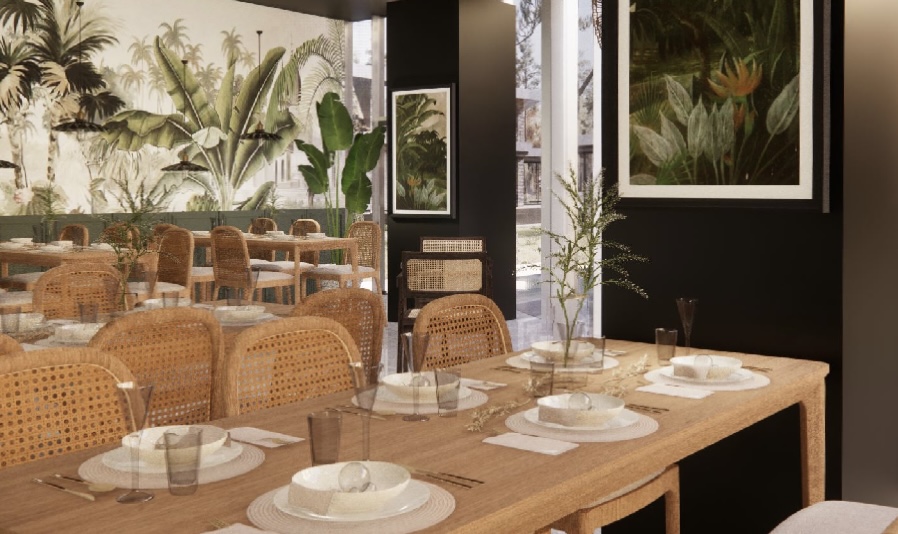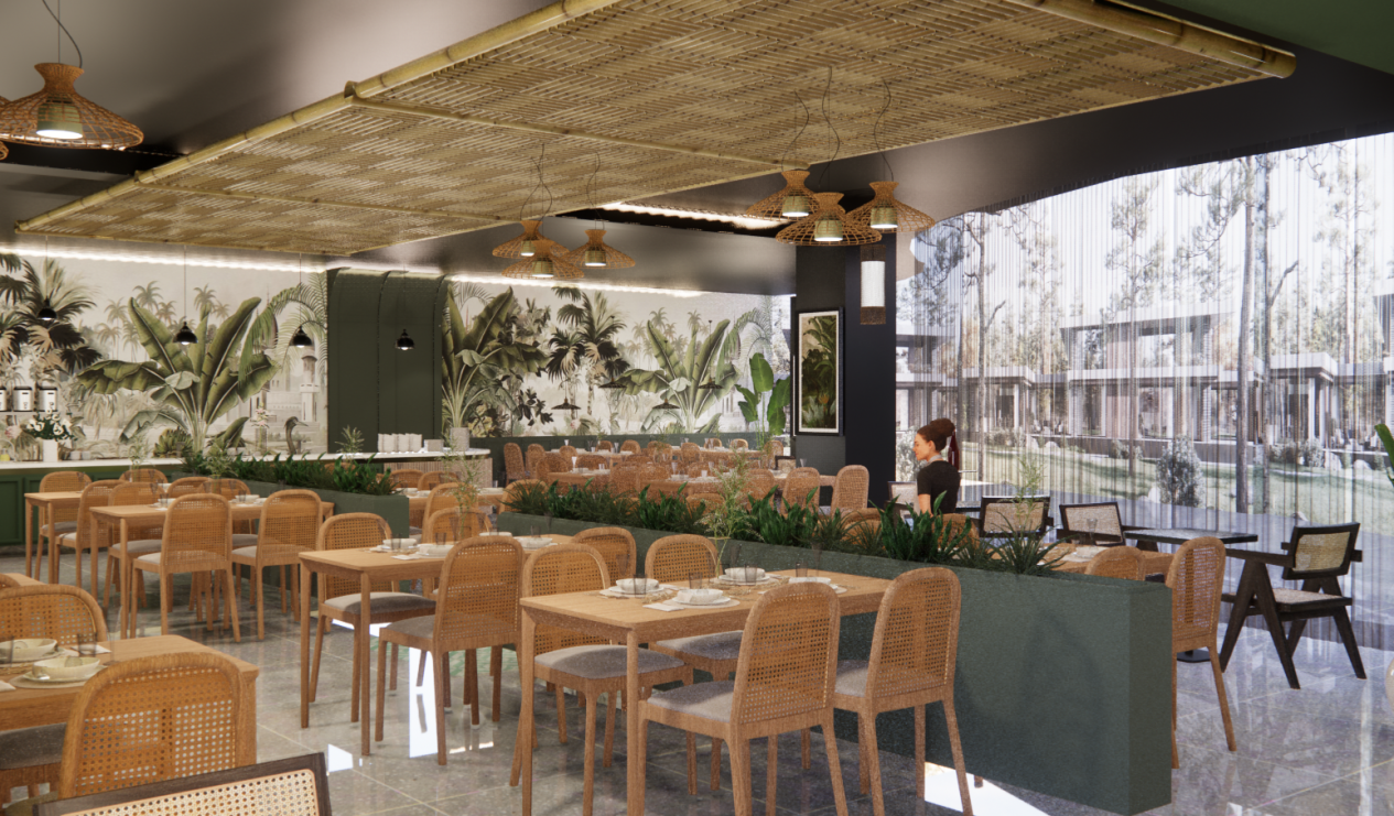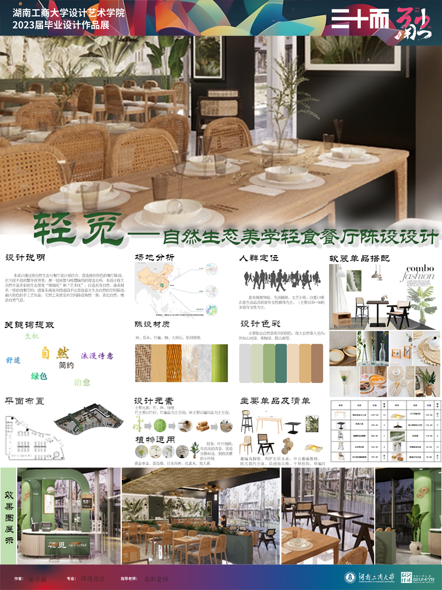 作品简介:本设计将大自然丰富多彩的生态景观“微缩化、艺术化”,将自然生态美学与餐厅设计相结合,营造独具特色的餐厅陈设。借鉴东南亚风情造园手法营造富含生态自然的空间陈设,融入特色手工艺制品,天然之美使空间陈设焕然一新,亲近自然,增添自然气息。