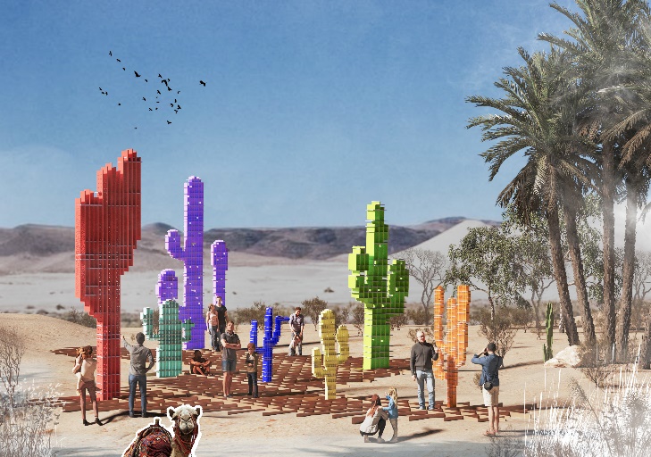 作品简介:民勤县被腾格里和巴丹吉林两大沙漠包围,自然风光独特、文化底蕴深厚,根据民勤地域特色进行沙漠公共艺术创作。向全世界展示民勤独有的地域特色,彰显民勤生态治理成果,传承保护防沙治沙文化,此装置通过可以在荒无人烟的沙漠里生存、不向命运低头永挺腰杆的“仙人掌”的形象和新时代自强不息、奋勇拼搏的默默治沙的广大民勤劳动者形象赞颂民勤沙漠的劳动者。做到视觉上“可观”,体验上“可游”,增进了空间活力和观众的参与度。饮水当思源,乘凉不忘栽树人。希望通本设计让枯燥的沙漠充满人文的光辉。