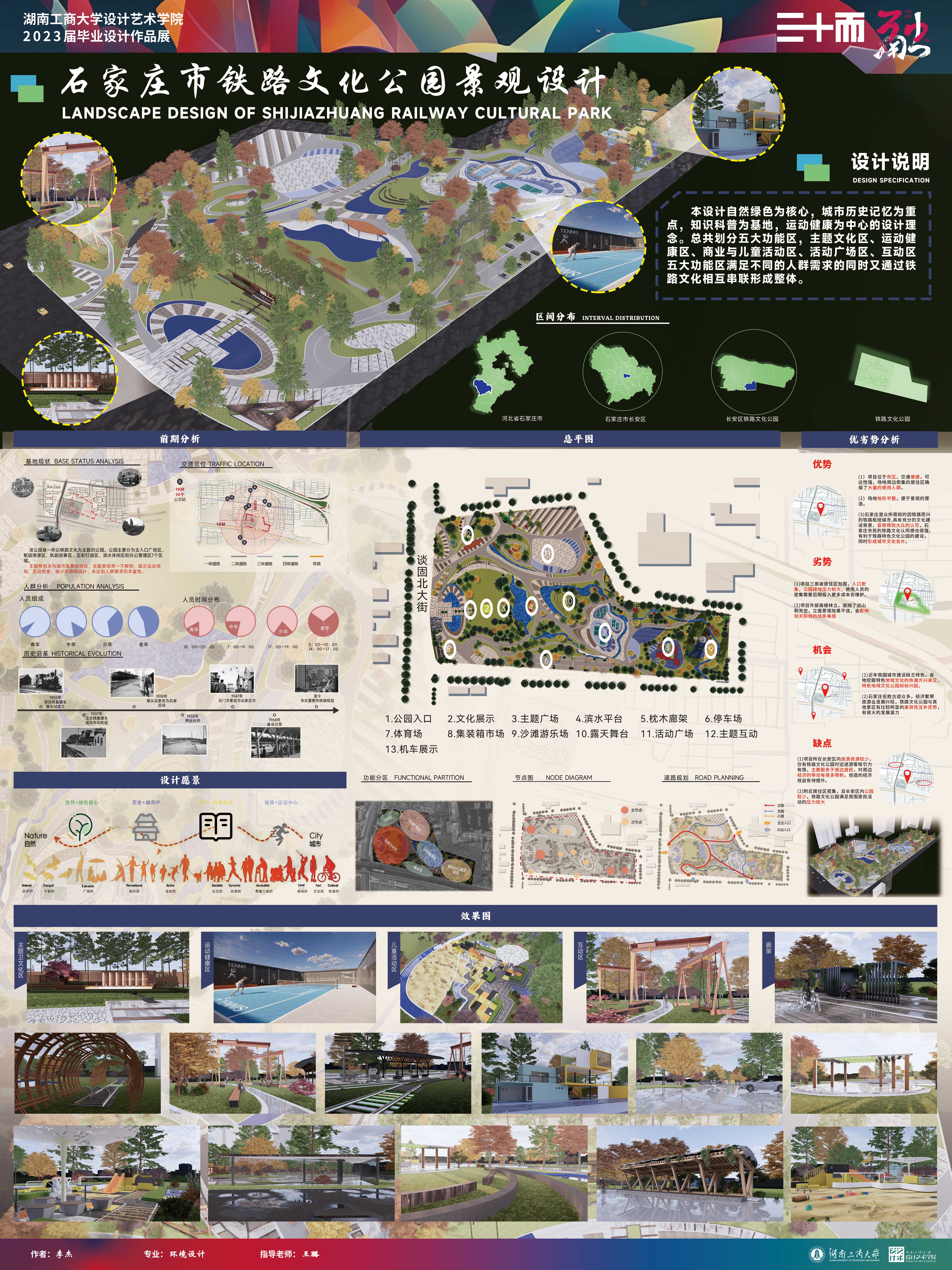 李杰作品简介:本设计以自然绿色为核心,城市历史记忆为重点,知识科普为基地,运动健康为中心的设计理念。总共划分五大功能区,主题文化区、运动健康区、商业与儿童活动区、活动广场区、互动区五大功能区满足不同的人群需求的同时又通过铁路文化相互串联形成整体。