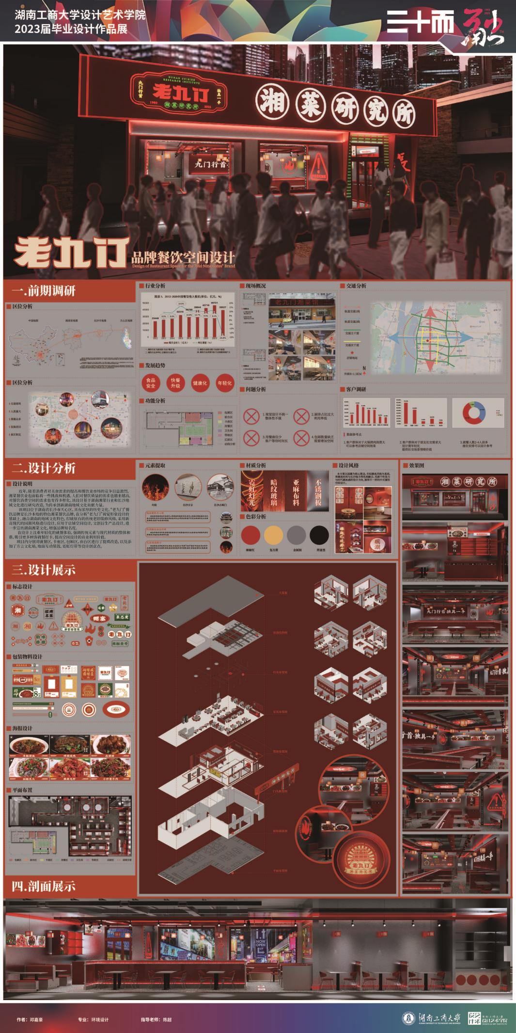 邓嘉豪作品简介:“老九门”餐饮品牌是长沙本地的特色湘菜餐饮品牌,融合湖南的地域文化特色,打破原有的传统老旧装修风格,采用新奇现代的国潮风格进行设计,应用于店铺空间设计,文创衍生产品设计,进一步宣传湖南湘菜文化,增强品牌知名度。在设计上注重年轻化的就餐体验,强调传统元素与现代材质的整体和谐,吸引更多顾客就餐打卡,提高空间设计的商业利用价值。