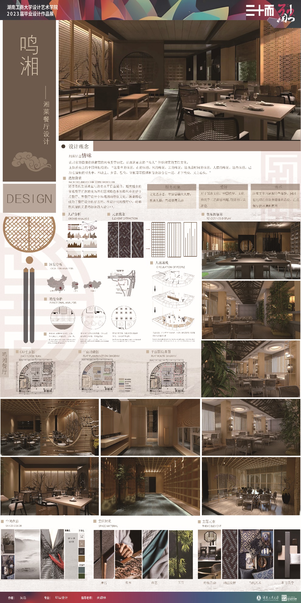吴浩作品简介:鸣湘湘菜餐厅带有浓郁的湖南文化和新中式元素,同时注重现代化的餐饮概念和服务,将湖南织锦元素融入到餐厅设计当中突出了餐厅的文化特色,能够让人们感受到中国传统文化和瑶族文化的历史与传承。