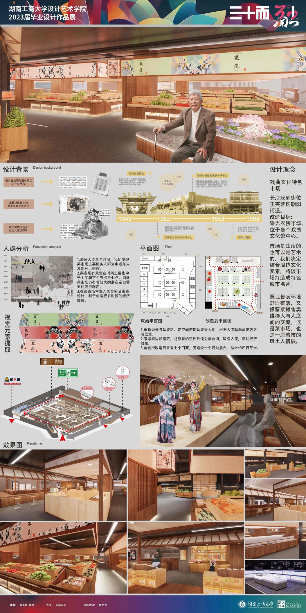 周旻瑄 陈想作品简介:设计理念为打造戏曲文化特色市场。曙光农贸市场位于各个戏曲文化馆中心,紧邻长沙戏剧街。市场是生活的,也可以是艺术的,我们决定结合周边文化元素,将该市场打造成特色城市名片,城市的风土人情展。