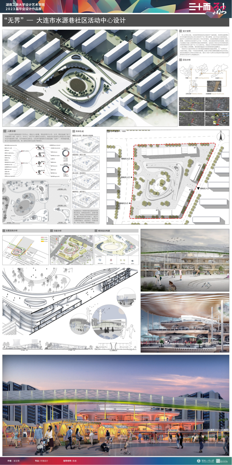 凌呈翔作品简介:本毕业设计以大连市沙河口水源南巷为选址背景,以“无界”为设计理念,营造一个没有具体界限,内部与外部互相联系融合的公共空间,意在改善城市之间社区邻里关系。探讨了基于无界共生理念的可漫步屋顶新型社区活动中心的建筑设计。