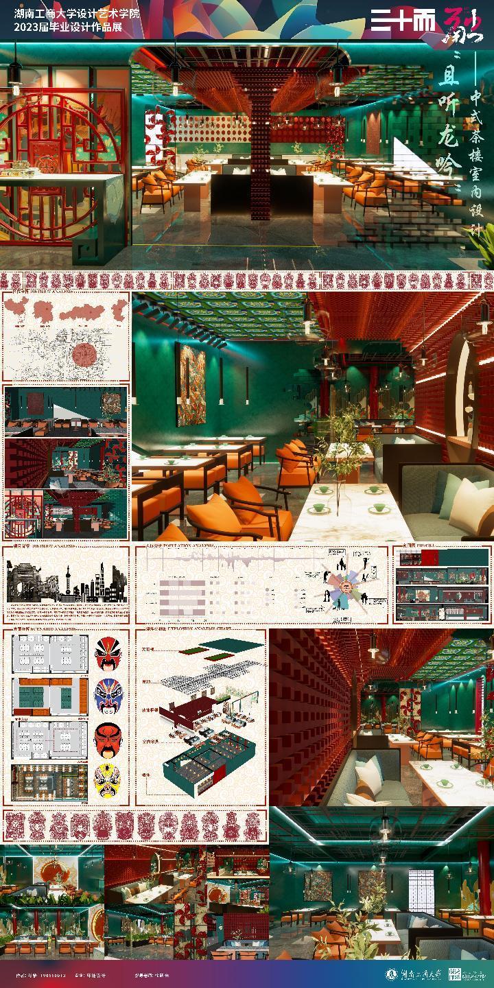 彭怡作品简介:本文将以中式国潮为核心理念,现代风格为基底,将潮流时尚与现代东方相融合。将国潮风格与充满个性张力与时代潮流感的设计方向,给空间带来更多的活力与多姿多彩。“且听龙吟”,以传统文化与现代设计理念相结合,使茶楼空间中的每一处细节都具有了国潮风。运用传统京剧文化元素,融入现代风格,将其更好的呈现在人们面前,使得空间中充满了东方韵味与时尚潮流相融合的视觉感受。借用一样的材质,演绎不一样的空间设计。