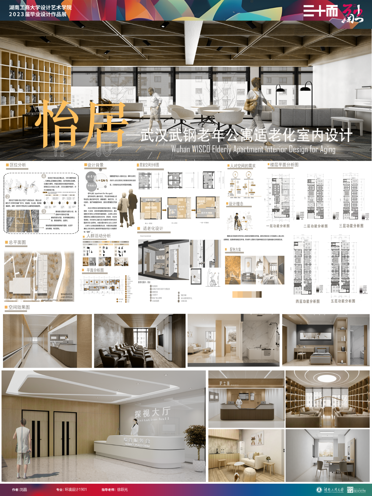 刘晶作品简介:本次设计将通过调查分析老年人对空间环境的需求,从老年人的生理需求和心理需求出发的交往性、舒适性、安全性等原则方面出发,将位于湖北武汉市青山区武钢计控公司生产大院旧址内一栋闲置建筑通过功能、空间、设施的设计将其改造为老年公寓。在设计中注重对老年人的人文关怀,从老年人自身实际的需求出发,在理论和实践的基础上体现老年公寓空间环境应如何设计才能更好地“适老”