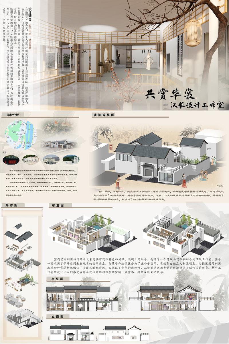 作者:吴婉欣作品简介:此项目围绕非遗传承的设计主题,依托后湖意创意工业园区和周边高校服装设计院校。意在打造一个集售卖、展示和研发制作中国文化遗产---汉服设计工作室。为汉服工作室注入一个“古今中华”的概念,用传统与现代并存的空间设计表达“东方意境之美”,弘扬中华传统文化。