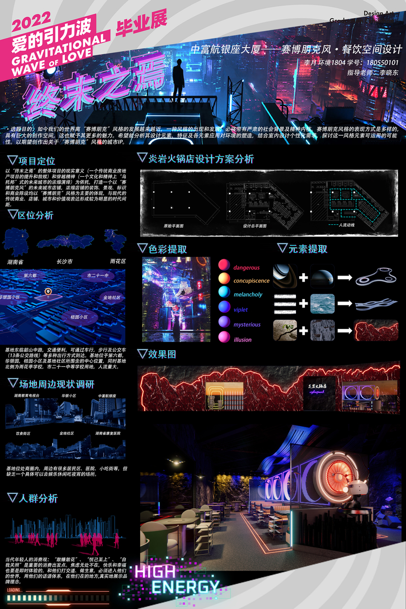 作者:王怡琴作品简介:以“双城故事”的概念去设计,新城高端科技感强烈,老城较为复古,风格定位赛博朋克。外建筑外围的广场主要体现科技感,场地分割提取酸性流体的形式,给人造成最直观的视觉享受,并将其色彩元素运用到后期设计当中。第二个区域“桔园夜市”一块位处于老城与新城交界处的地方,桔园夜市是一个集展示、售卖、路演、打卡四个功能为一体的神秘区域,白天不营业,只有当夜幕降临,赛博朋克公路派对就开始了。