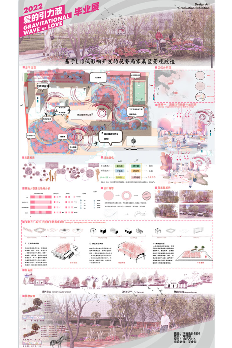 作者:刘铠硕作品简介:在本次城市老旧小区改造的过程中,主要以LID低影响策略为设计主题,在设计中,以LID为导向的街头开放空间设计的主要特点:生态景观:将景观和雨洪管理结合,是面向未来的新型景观;自然法则:尊重自然性,追求低投入、低维护、低影响开发理念;体验式景观:注重人性化的自然体验和互动参与,追求自然教育和生态教育,尊重文化和地域性。此次设计中他,还将雨水街坊引入其中,雨水街坊是海绵城市的组成器官,是介于雨水花园(细胞体)和海绵城市(有机体)中观尺度最重要的城市构成。它本身具备了完整的单元属性。