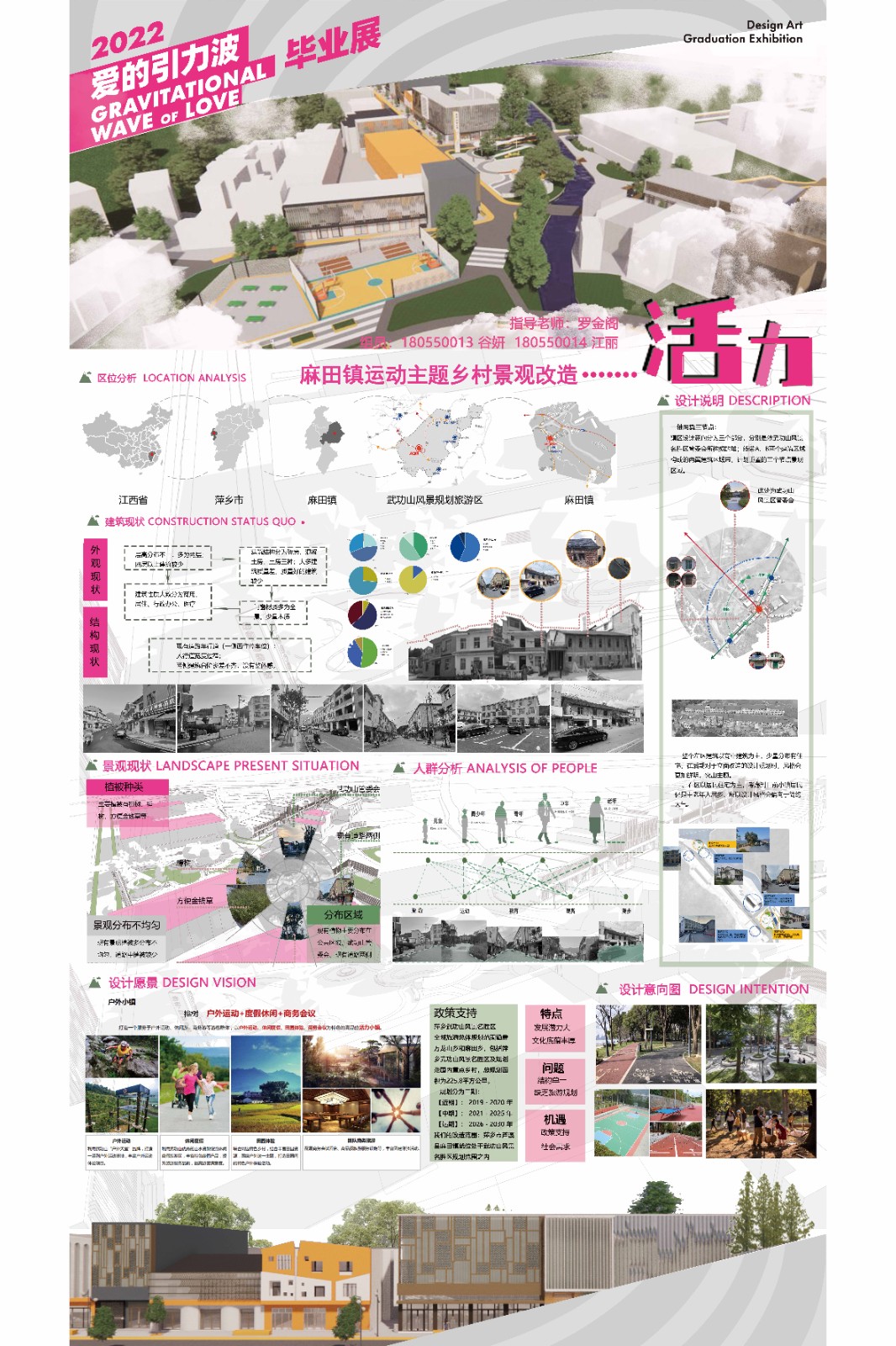 作者:谷妍、江丽作品简介: 位于武功山脚下的麻田镇有着丰富的资源禀赋,绿水青山是麻田镇乡村的宝贵财富。我们将运动元素融入到本次对于镇区内建筑及景观的改造上,从地域文化、符号语言及色彩表达三个维度出发,一改小镇里沉闷的环境,使气氛更加活泼。充满设计感的不规则建筑及景观设计,让人们觉得充满活力,缓解压力。