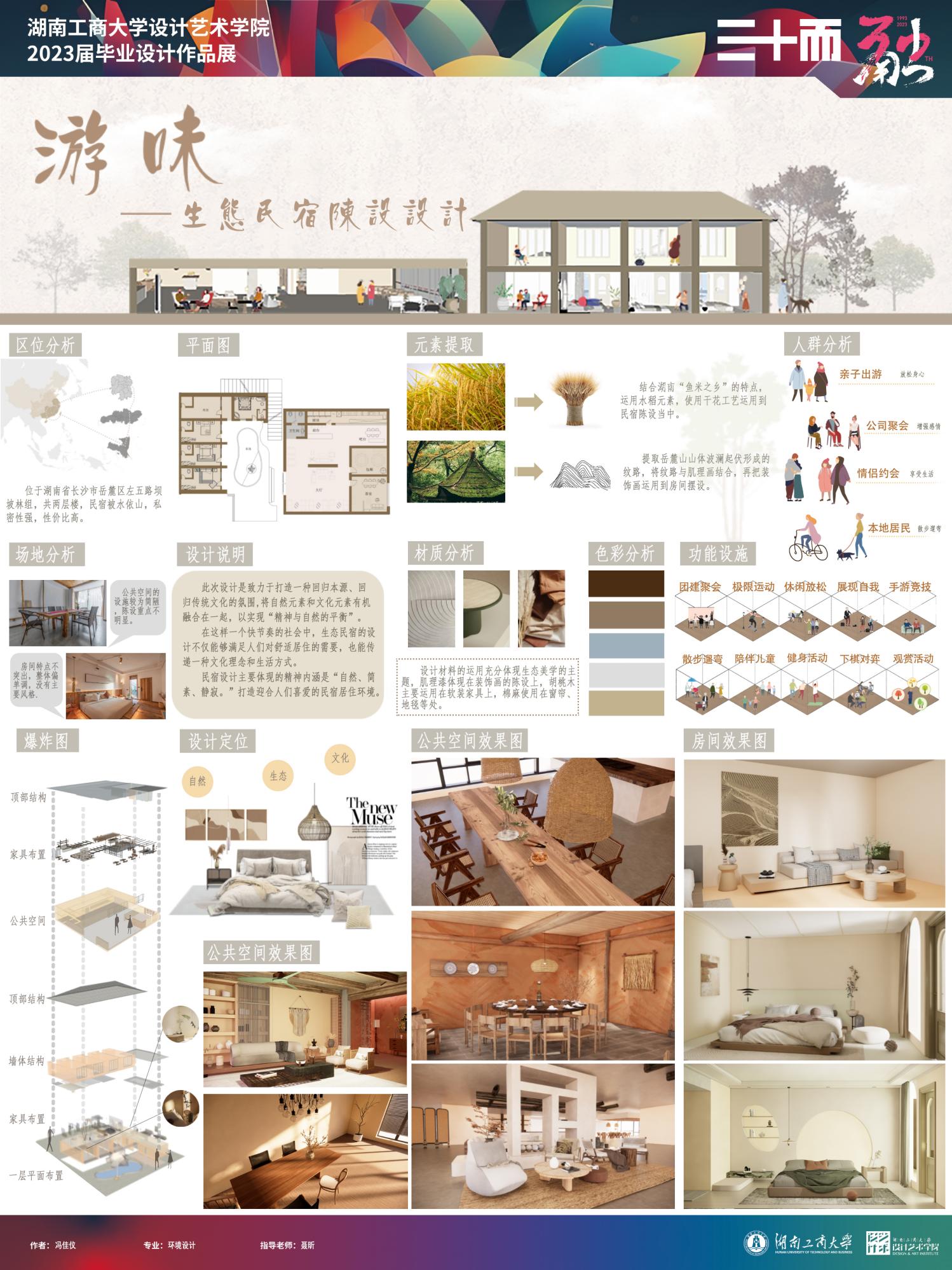 冯佳仪作品简介:此次设计是致力于打造一种回归本源、回归传统文化的氛围,将自然元素和文化元素有机融合在一起,以实现“精神与自然的平衡”。民宿设计主要体现的精神内涵是“自然、简素、静寂”,打造迎合人们喜爱的民宿居住环境。