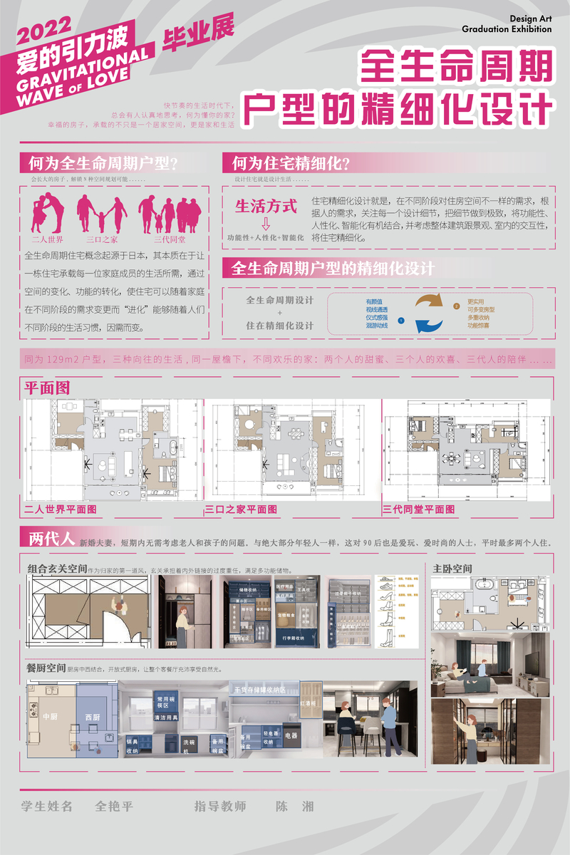 作者:全艳平作品简介:根据全生命周期户型和精细化设计,在生活中的细节为出发点进行户型的精细化设计。以90后作为客群出发设计出一套房子,来满足他们的所有需求,因此在这我们精选了三个有故事的家,同一个129㎡户型, 三种向往的生活。