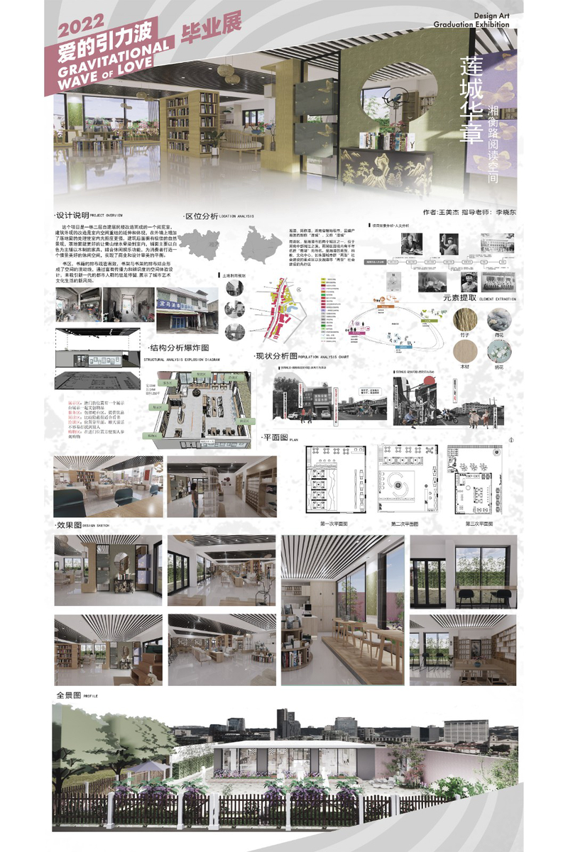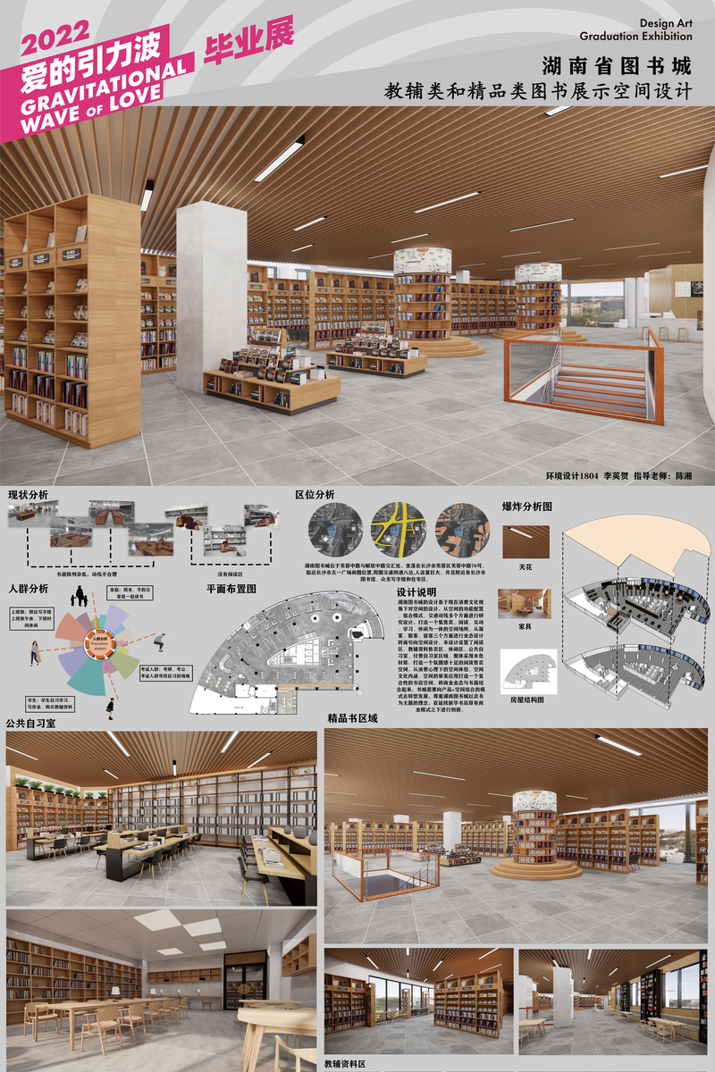 作者:李英贺作品简介:湖南图书城的设计基于现在消费文化视角下对空间的设计,从空间的功能配置、组合模式、交通动线多个方面进行研究设计,打造一个集售卖、阅读、互动、学习、休闲为一体的空间场所。从凝客、聚客、留客三个方面进行业态设计转而引向空间设计。