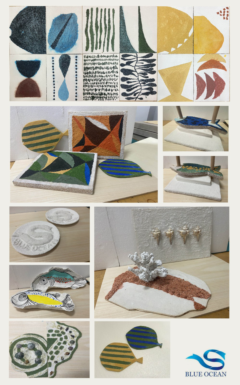 作品简介:根据蓝丝带海洋保护协会的企业调性,选取最具有代表性、分布最为广泛的鱼类为设计素材,进行造型提取,使用岩彩材料为创作载体进行主体及衍生品设计,最终达到为企业推广的效果。