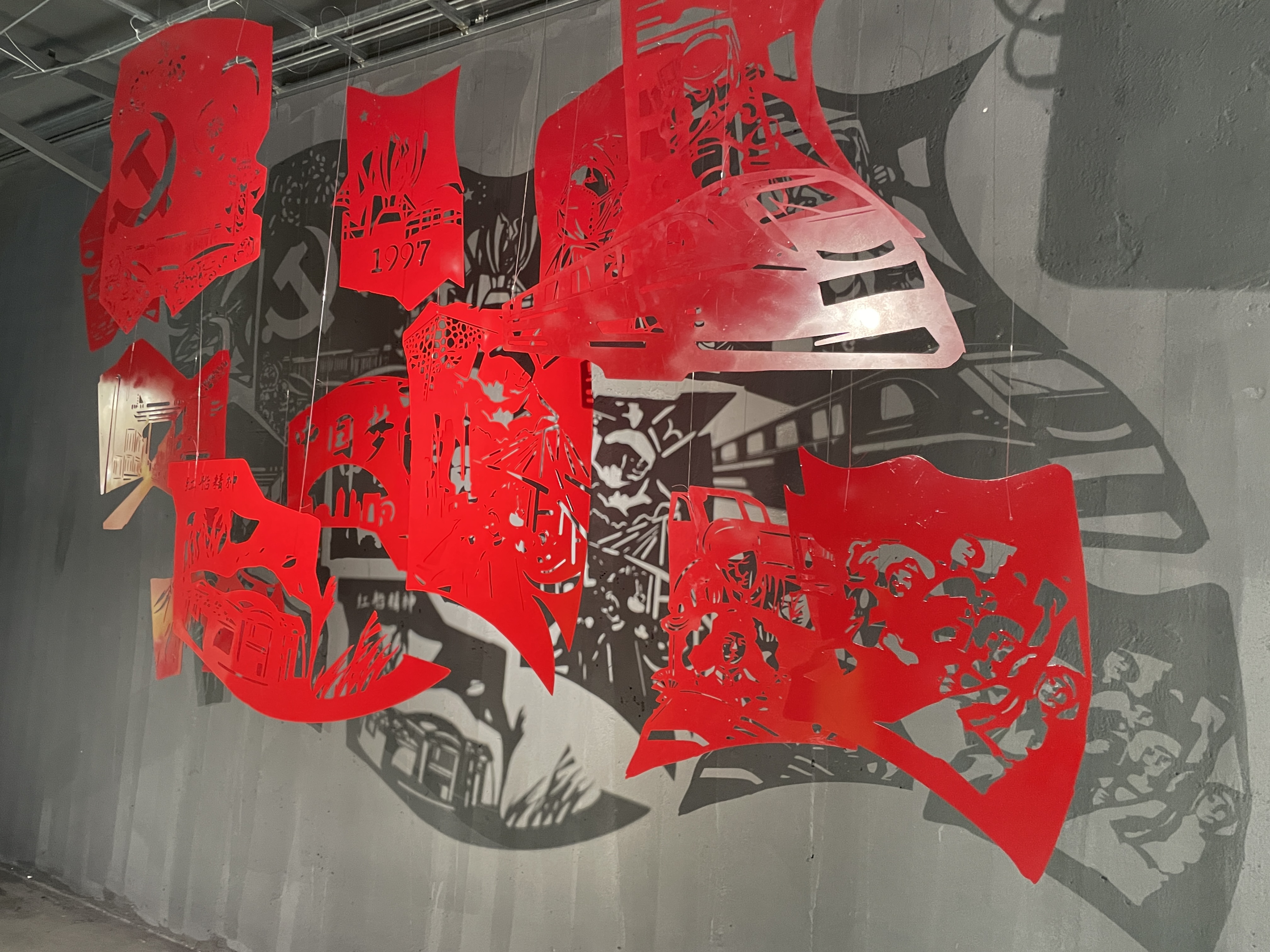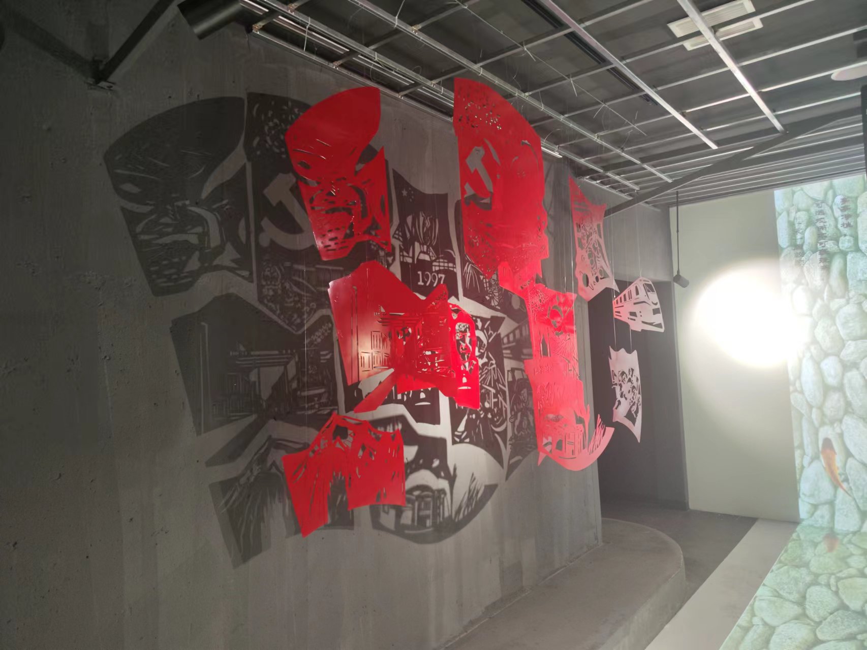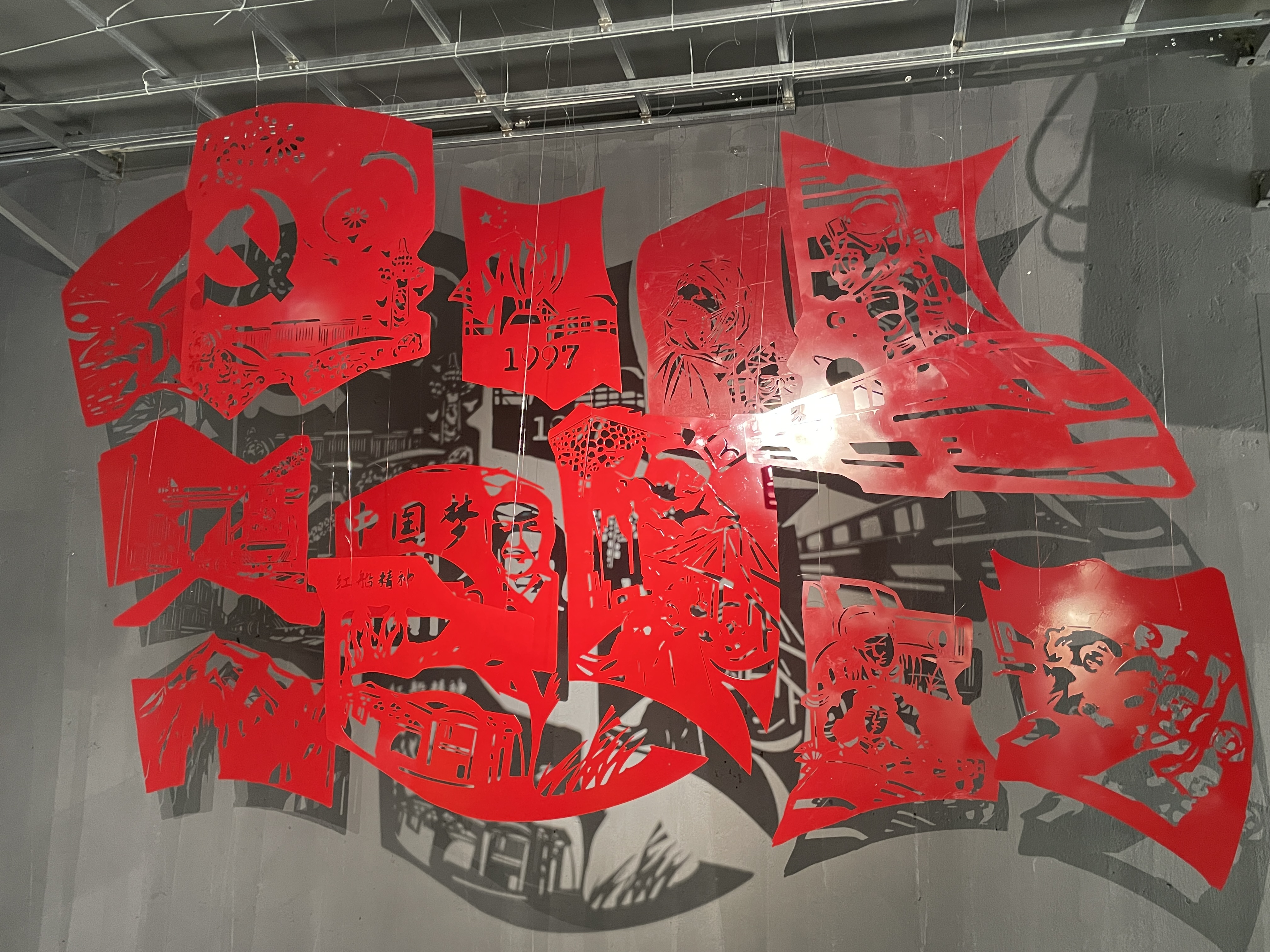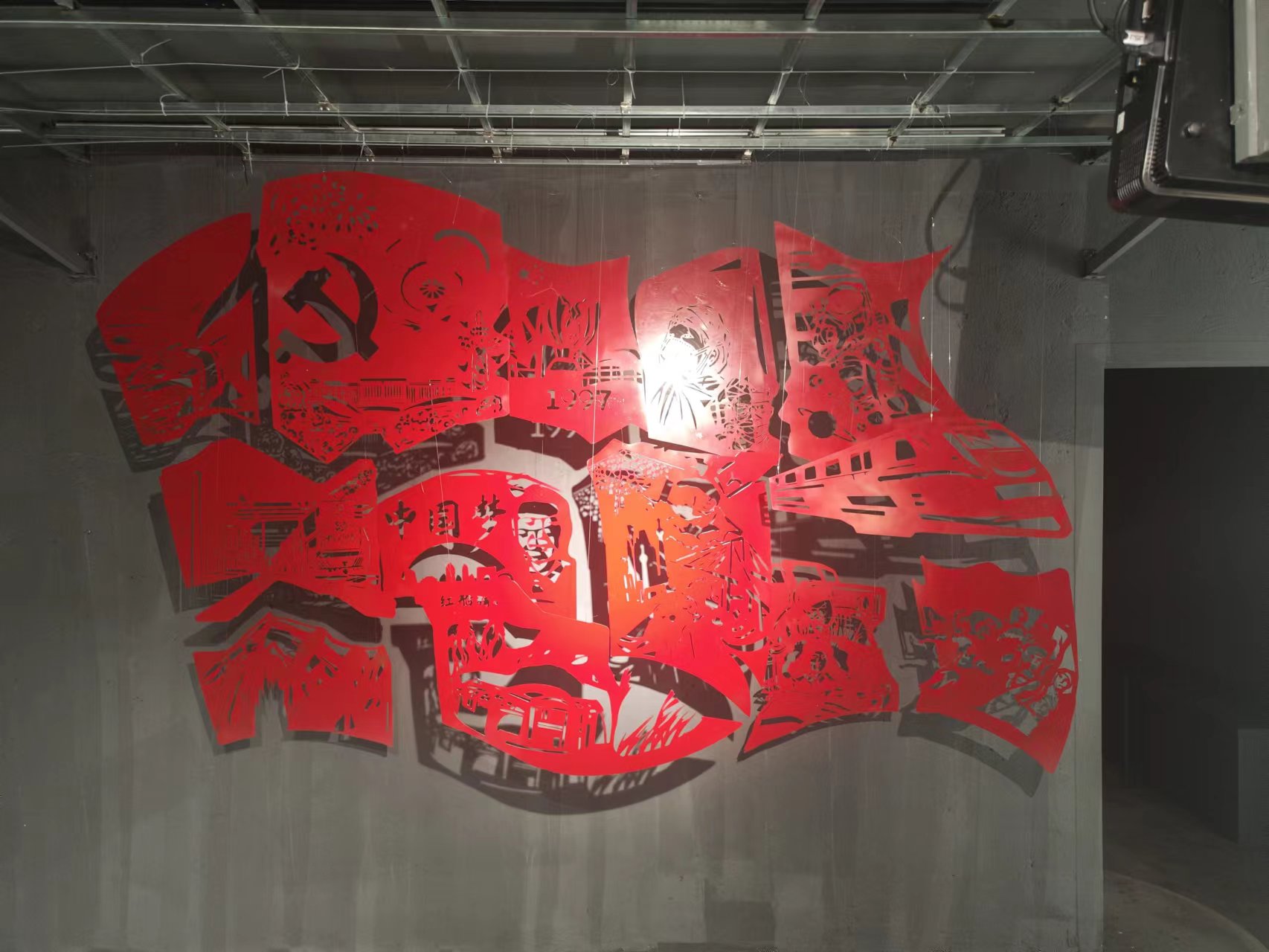 作品简介:“与光同行,跟党践行”是一件结合剪纸与雕刻技术的镂空雕刻装置艺术设计。通过平面剪纸和镂空装置的巧妙结合,搭配光影效果,保留了民间剪纸的风格特点的同时在空间形态和视觉表现方面进行了突破和创新,并运用现代设计理念中的光影和空间装置元素,打造出一个集“场地+材料+情感”于一体的综合展示效果。一面由大小不一的红色精神文化装置拼接而成的旗帜,彰显了党建精神的青春活力,此设计以微薄之力、热诚之心宣传党建精神与革命精神,让人们铭记过去、总结现在、展望未来。