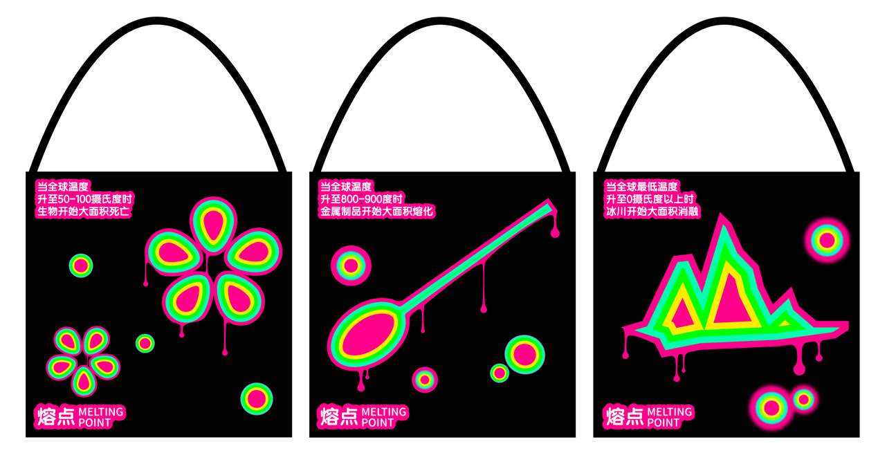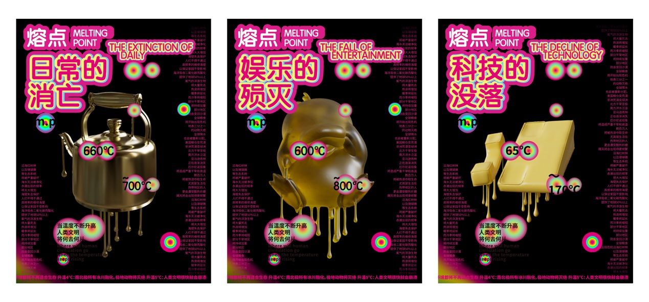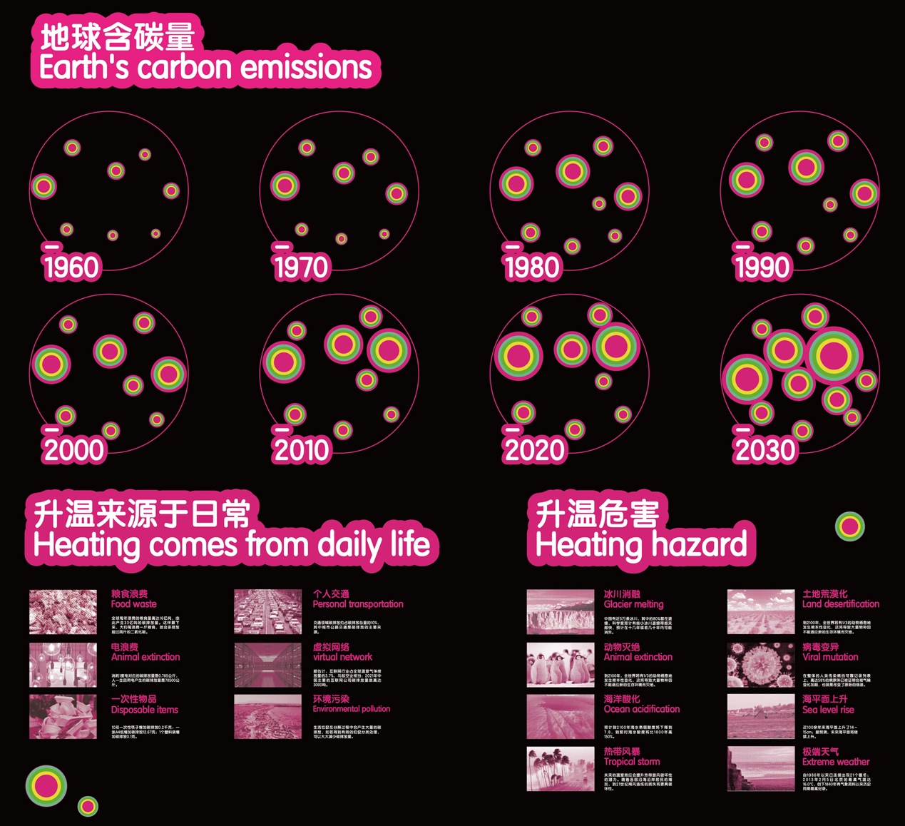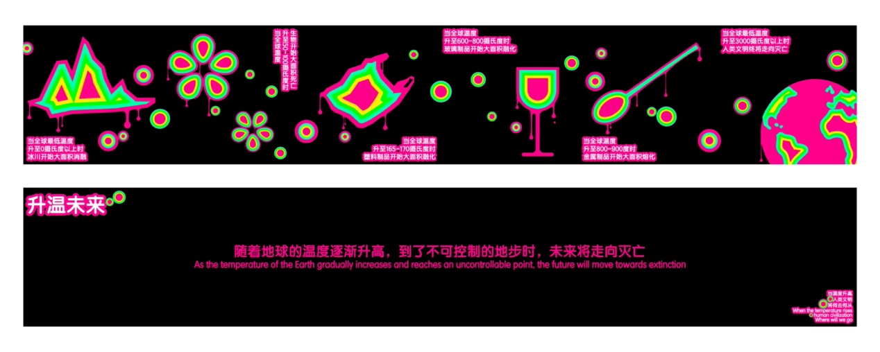 作品简介:此设计为碳排放导致升温问题的动态海报设计,通过碳排放、温度上升的相关元素组合设计,随着碳排放量增加,温度逐渐升高而导致人类生活中日常、娱乐、科技三个方面将走向灭亡的假想,表达碳排放过量过大将有导致人类文明灭亡的可能,以此呼吁人们减少排碳,重视二氧化碳排放会导致的后果。