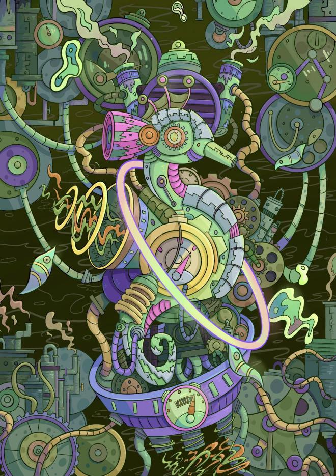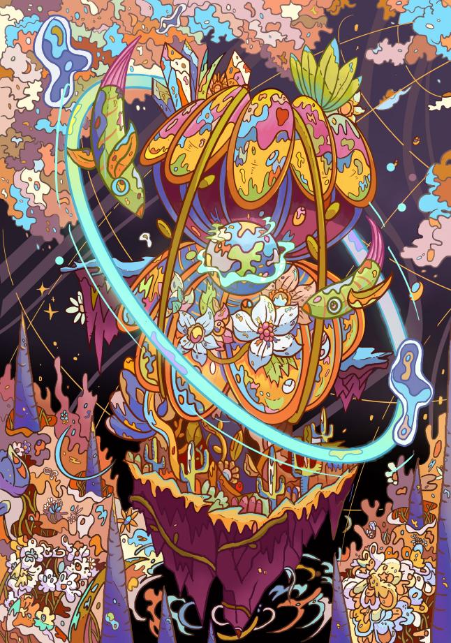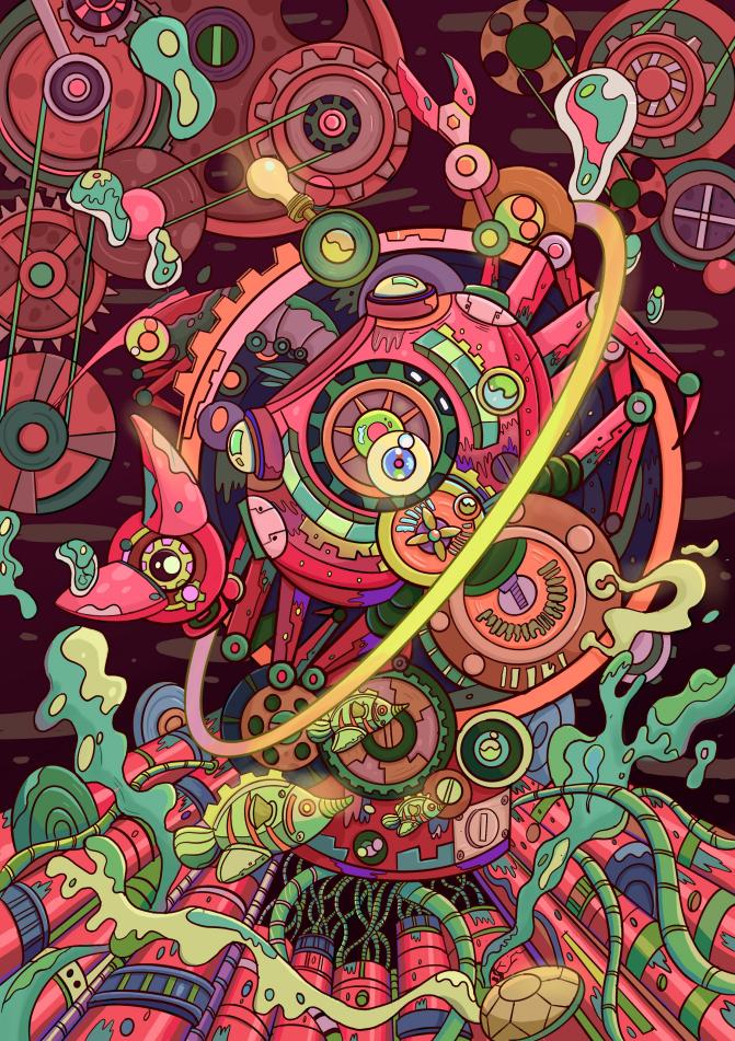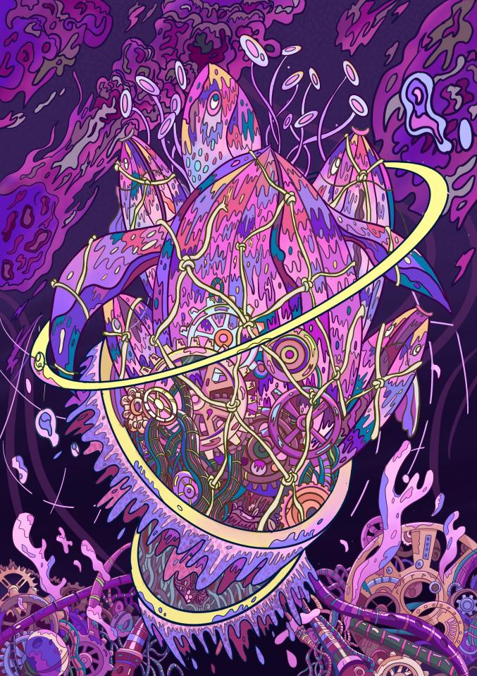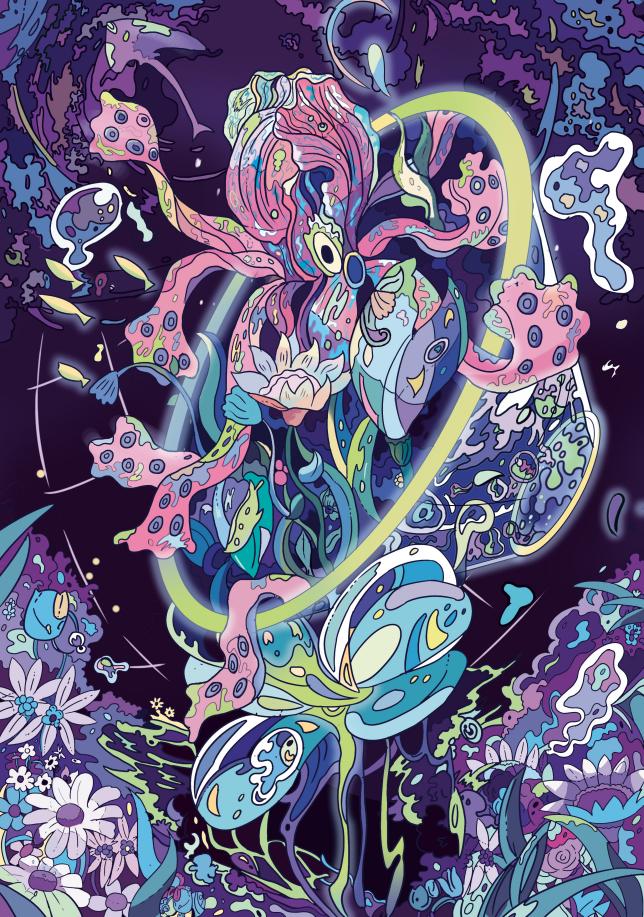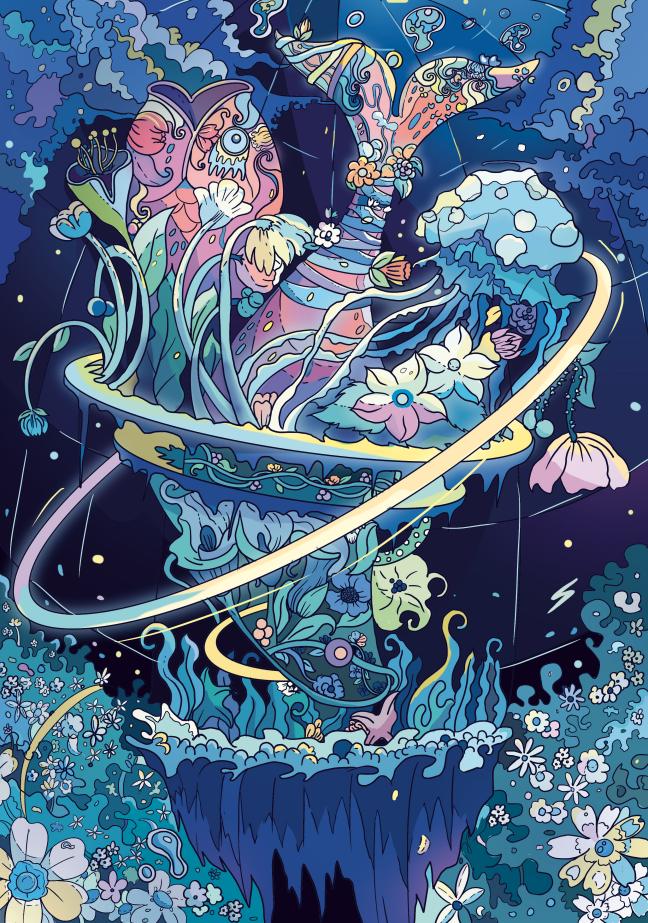 作品简介:该系列插画以“异世界的鱼”为主题,旨在表现当前污染严重的海洋生态环境。以变异的海洋生物为主体,比如章鱼、鲸、海马、海龟、螃蟹、蚌。通过机械元素表达人类工业化对海洋环境造成的恶劣影响,同时利用花草倡议保护海洋环境,打造美好生态,形成正反面的设计宗旨。插画以红、黄、蓝、绿、紫为主色调,色彩鲜明并形成冷暖对比,希望通过这系列插画引起人们对海洋生态环境的重视。
