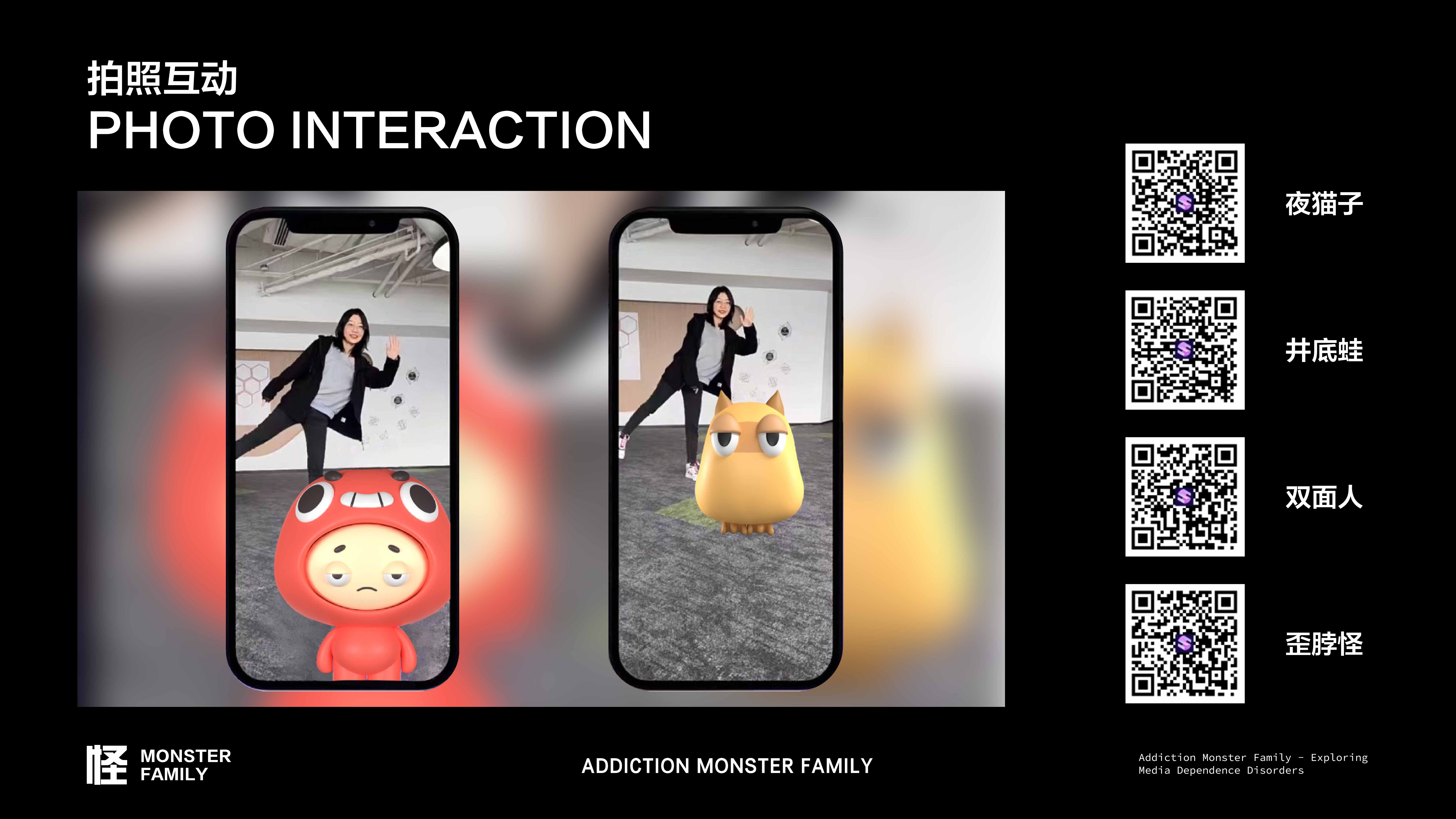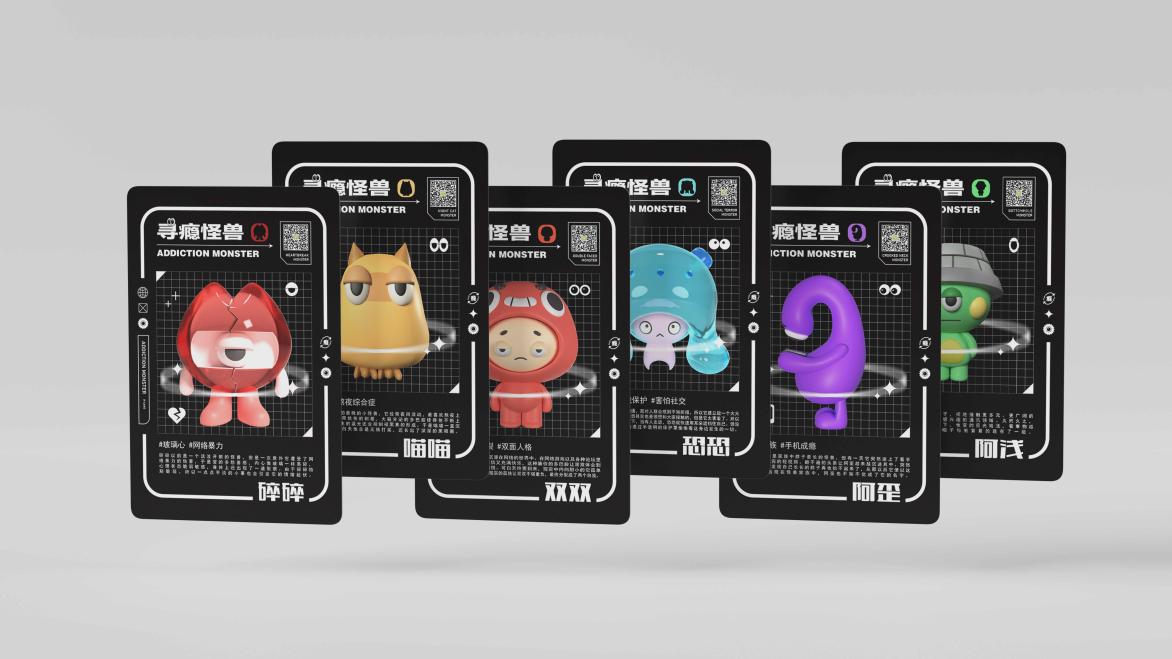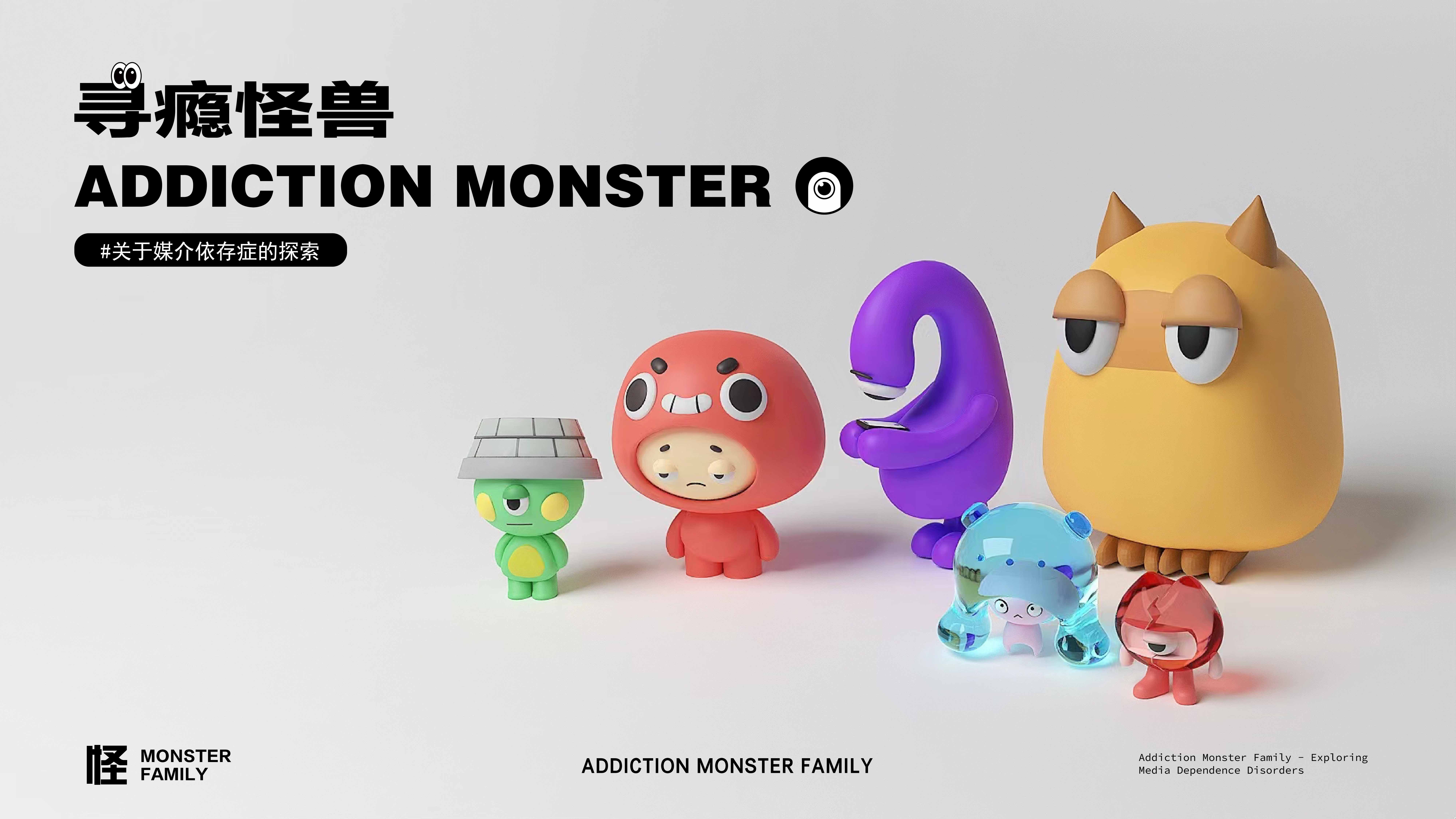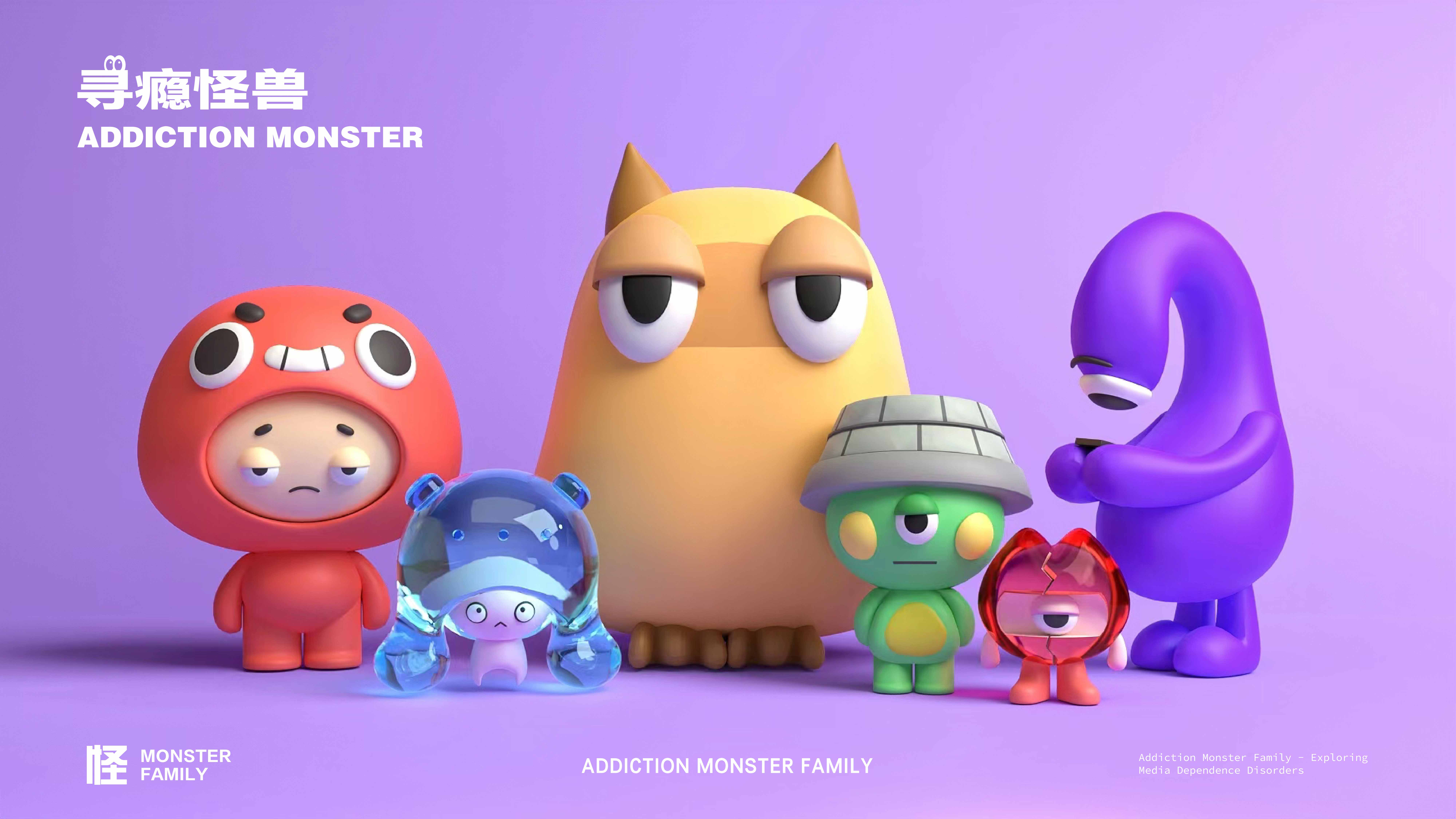 作品简介:电子介质已经成为我们当代生活中离不开的一部分,对于社交媒体的沉迷也是当代生活中一直探讨的话题。对此以6个IP为切入点,组成寻瘾怪兽家族,这个家族中的怪兽都是深受媒介的影响导致不同程度的上瘾。利用IP等视觉元素加强媒介依存症患者的认知,并呼吁大众对这些现象加以重视,避免深陷媒介成瘾。