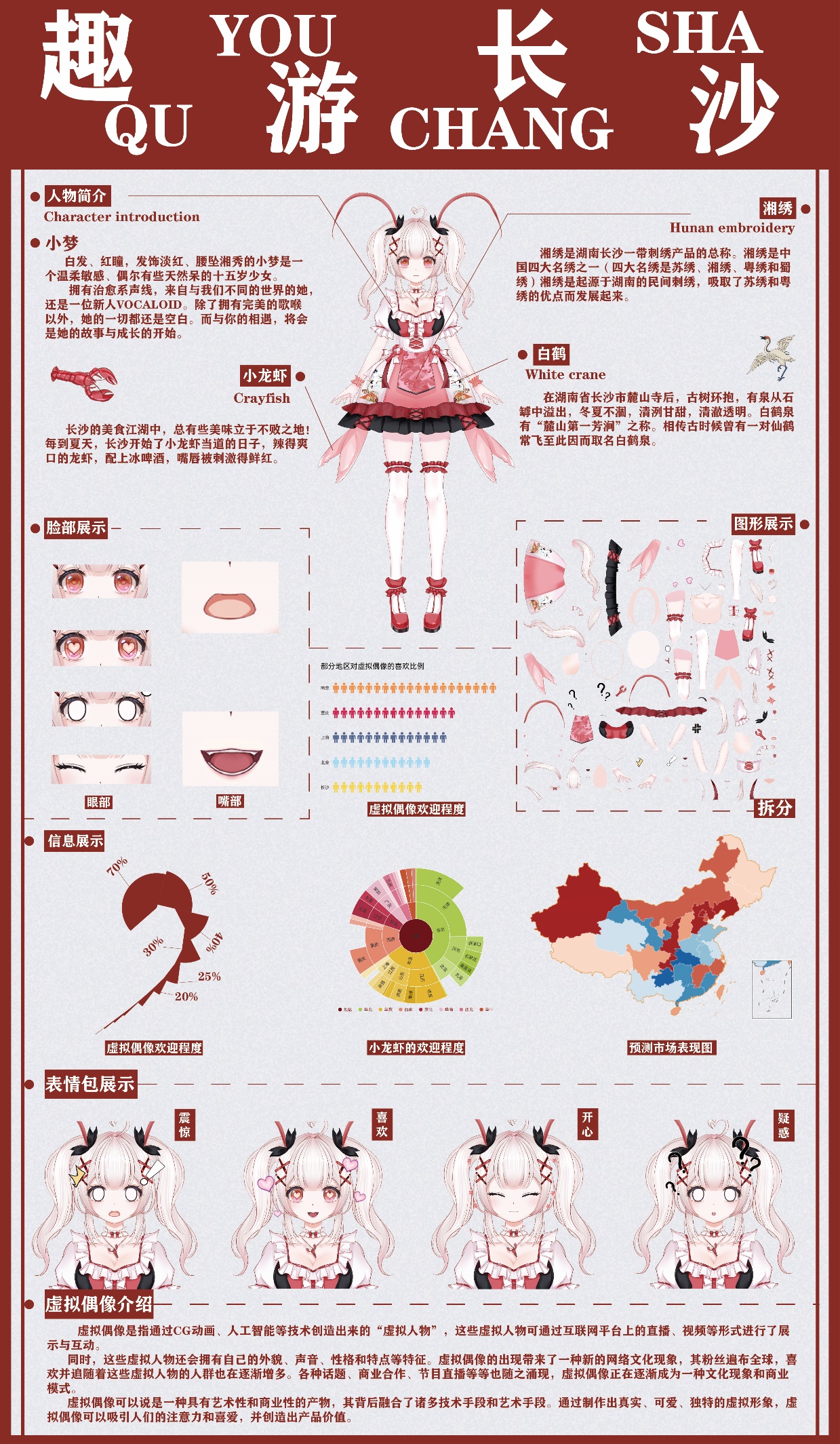 作品简介:本项目基于长沙文化元素进行虚拟角色形象设计,在平面等方面进行设计增加文化元素的传承和推广效果,还能够吸引更多的用户关注和参与,促进社交网络、游戏、VR等相关领域的发展。实现了长沙虚拟偶像品牌形象的创新与提升,强调了其本土特色,并创造性地将传统元素与现代元素融合在一起,使品牌形象更具有吸引力和辨识度。