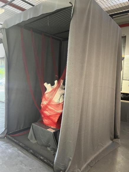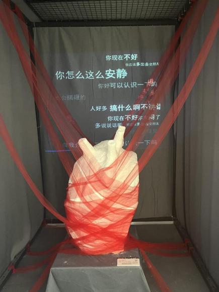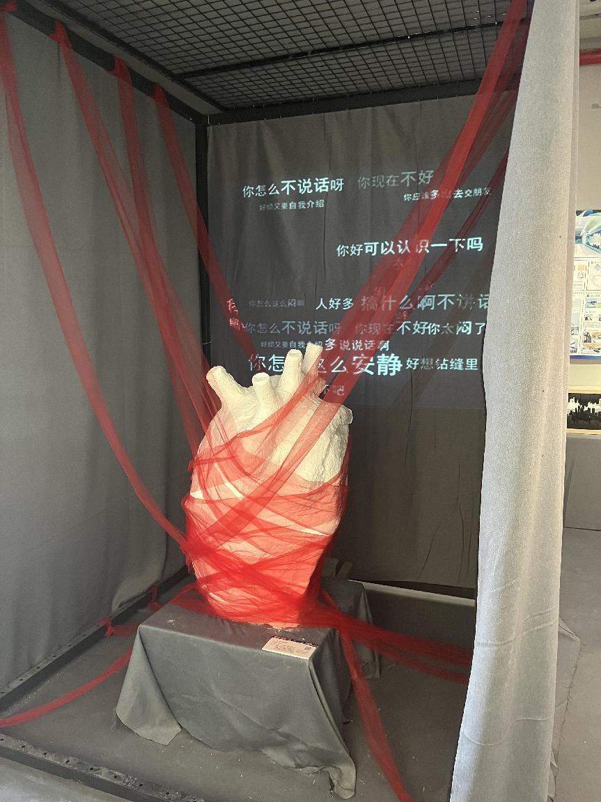 作品简介:本设计提取社恐患者在社恐情绪下的心理活动,通过装置的方式来呈现,同时提取社交情景下的语言文字,以及社恐患者的心理独白作为本设计中的文字元素,用红色纱幔将心脏束缚,来体现社恐患者被社交束缚的形象。通过提取社交场景中导致社恐情绪的文字作为影像的主体元素来制作影像,对主体文字进行放大加粗的处理,结合装置达到营造整体氛围的目的。