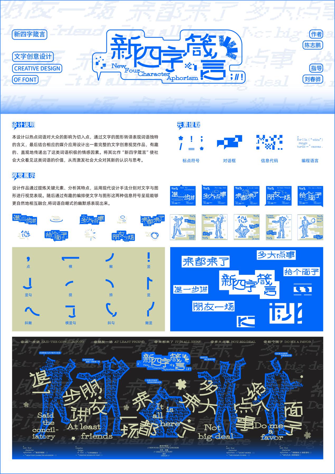 作品简介:本设计以热点词语对大众的影响为切入点,通过文字的图形转译表现词语独特的含义,最后结合相应的媒介应用设计出一套完整的文字创意视觉作品,有趣的、直观地传递出了这类词语积极的情感因素。将其比作“新四字箴言”使社会大众看见这类词语的价值,从而激发社会大众对其新的认识与思考。